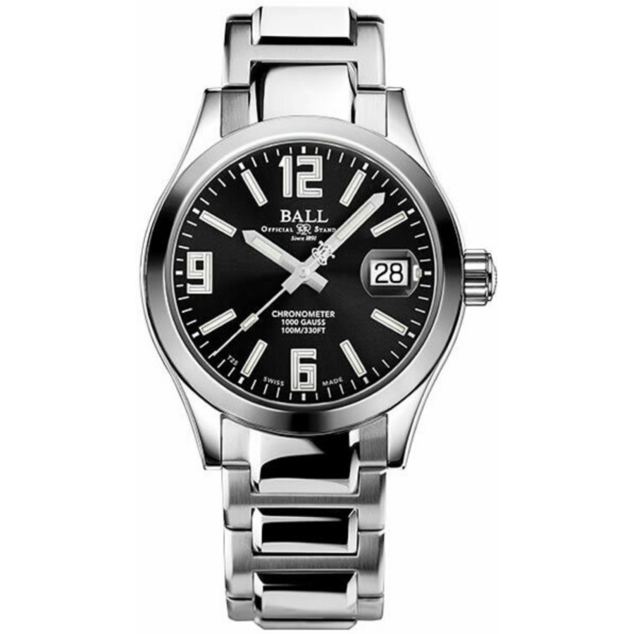 Stainless steel case with a stainless steel bracelet. Fixed stainless steel bezel. Black dial with luminous silver-tone hands and index hour markers. Arabic numerals appear atthe 6, 9 and 12 o'clock positions. Minute markers around the outer rim. Dial Type: Analog. Luminescent hands and markers. Date display at the 3 o'clock position. BALL calibre RR1103-C automatic movement, based upon ETA 2824-2, containing 25 Jewels, bitting at 28800 vph, and has a power reserve of approximately 38 hours. Scratch resistant sapphire crystal. Screw down crown. Solid case back. Round case shape, case size: 40 mm, case thickness: 12.45 mm. Fold over clasp. Water resistant at 100 meters / 330 feet. Functions: calendar, date, hour, minute, second, shock resistant, sport, water resistant. Engineer IIi Pioneer Series. Casual watch style. Watch label: Swiss Made. Ball Engineer III Pioneer Automatic Black Dial Unisex Watch NM2026C-S15CJ-BK.