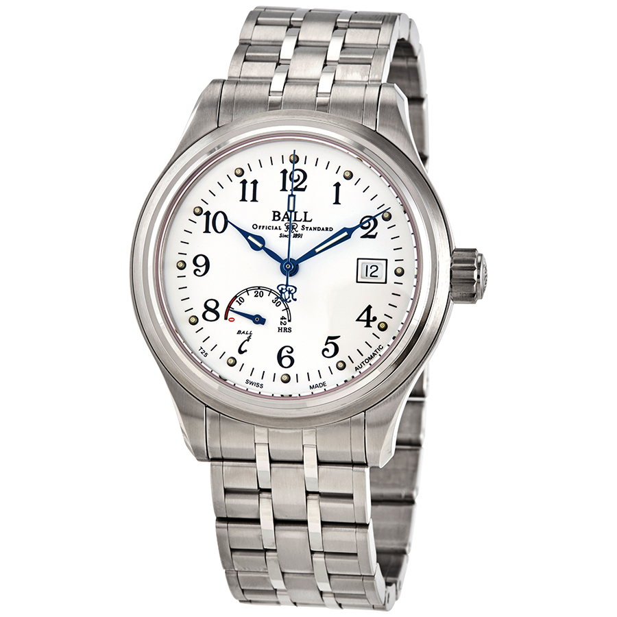 Silver-tone stainless steel case with a silver-tone stainless steel bracelet. Fixed silver-tone stainless steel bezel. White dial with blue hands and Arabic numeral hour markers. Minute markers around the outer rim. Dial Type: Analog. Luminescent hands and markers. Date display at the 3 o'clock position. One - power reserve indicator subdial. BALL Calibre RR1702 automatic movement with a 42-hour power reserve. Scratch resistant sapphire crystal. Transparent case back. Round case shape, case size: 41 mm, case thickness: 12 mm. Water resistant at 50 meters / 165 feet. Functions: date, hour, minute, second, power reserve indicator. Luxury watch style. Watch label: Swiss Made. Item Variations: NM1056D S1J WH, NM1056D.S1J.WH, NM1056DS1JWH. Ball Trainmaster Automatic White Dial Watch NM1056D-S1J-WH.