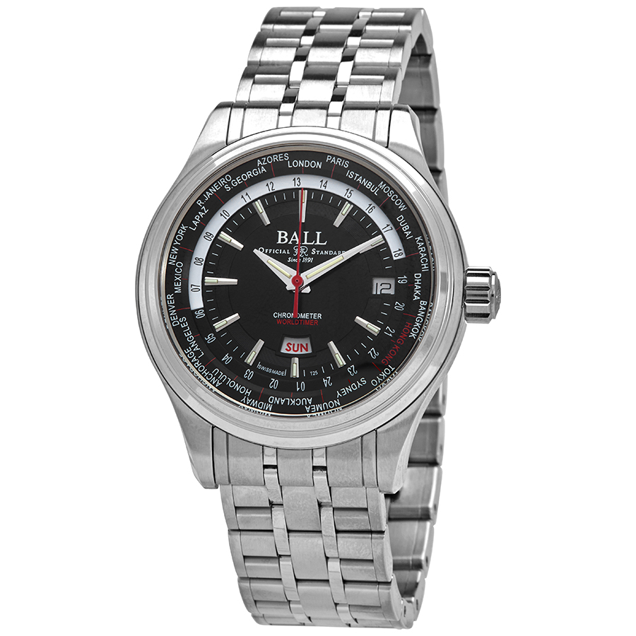 Silver-tone stainless steel case with a silver-tone stainless steel bracelet. Fixed silver-tone stainless steel bezel. Black dial with silver-tone hands and Arabic numeral hour markers. World markers around the outer rim. Dial Type: Analog. Luminescent hands and markers. Date display at the 3 o'clock position. BALL Calibre RR1501-C automatic movement with a 38-hour power reserve. Scratch resistant sapphire crystal. Transparent case back. Round case shape. Case size: 41 mm. Water resistant at 50 meters / 165 feet. Functions: world time, date, day, GMT, second time zone, hour, minute, second. Casual watch style. Watch label: Swiss Made. Ball Trainmaster Worldtime Automatic Black Dial Mens Watch GM2020D-S4CJ-BK.