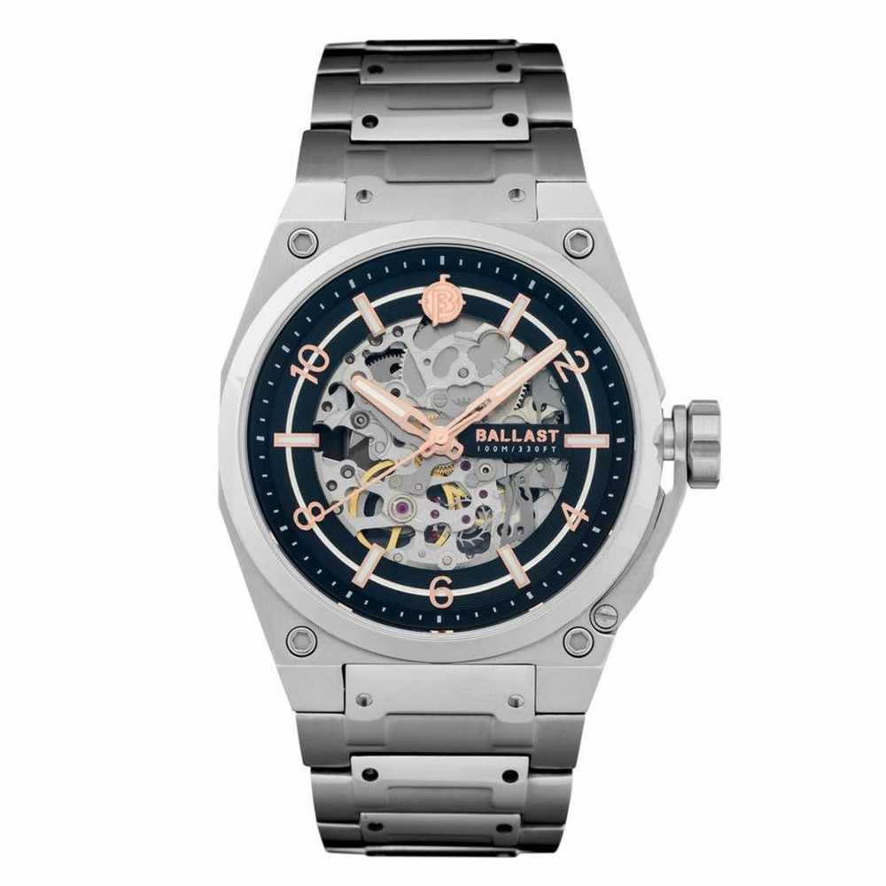 Silver-tone stainless steel case and bracelet. Fixed silver-tone stainless steel bezel. Black dial with rose gold-tone hands and Arabic numeral & index hour markers. Minute markers around the outer rim. Dial Type: Analog. Luminescent hands and markers. Automatic movement. Transparent see through case back. Round case shape, case size: 40 mm, case thickness: 13 mm. Fold over clasp with a safety release. Water resistant at 100 meters / 330 feet. Functions: hour, minute, second. Valiant (officer) Series. Dress watch style. Ballast Valiant (Officer) Automatic Black Dial Mens Watch BL-3144-11.