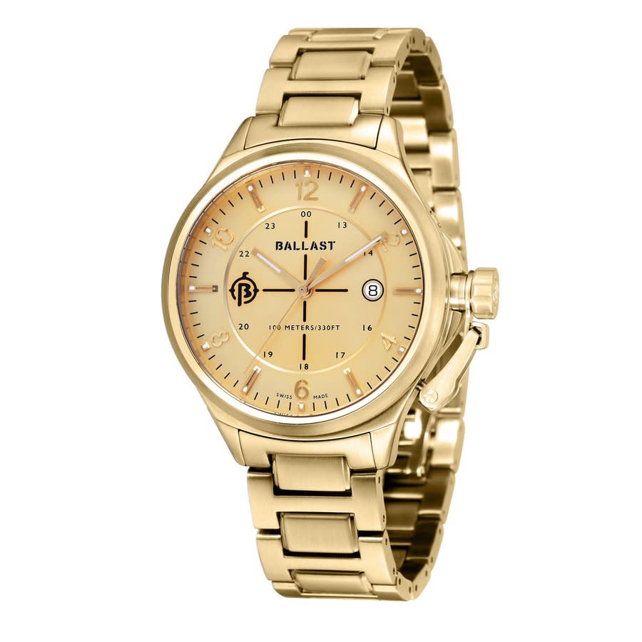 Gold-tone stainless steel case with a gold-tone stainless steel bracelet. Fixed bezel. Champagne dial with gold-tone hands and index and Arabic numeral hour markers. Minute markers around the outer rim. Dial Type: Analog. Date display at the 3 o'clock position. Swiss quartz movement. Scratch resistant sapphire crystal. Solid case back. Case size: 46.5 mm. Case thickness: 10.4 mm. Round case shape. Deployment clasp. Water resistant at 100 meters / 330 feet. Functions: date, hour, minute, second. Dress watch style. Watch label: Swiss Made. Ballast Trafalgar Champagne Dial Mens Watch BL-3125-55.