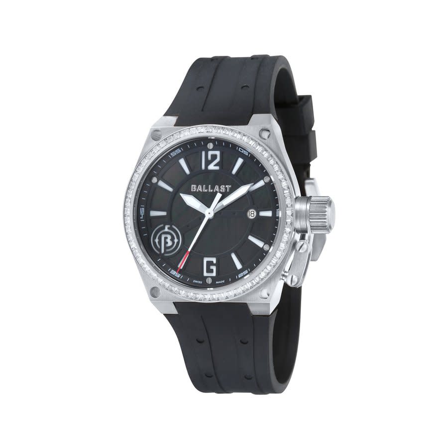 Silver-tone stainless steel case with a black silicone strap. Fixed silver-tone crystal-set bezel. Black mother of pearl dial with silver-tone hands and index hour markers. Dial Type: Analog. Date display at the 3 o'clock position. Quartz movement. Scratch resistant mineral crystal. Case size: 42 mm. Round case shape. Water resistant at 100 meters / 330 feet. Functions: date, hour, minute, second. Casual watch style. Watch label: Swiss Made. Ballast Valiant Mother of Pearl Ladies Watch BL-5103-04.