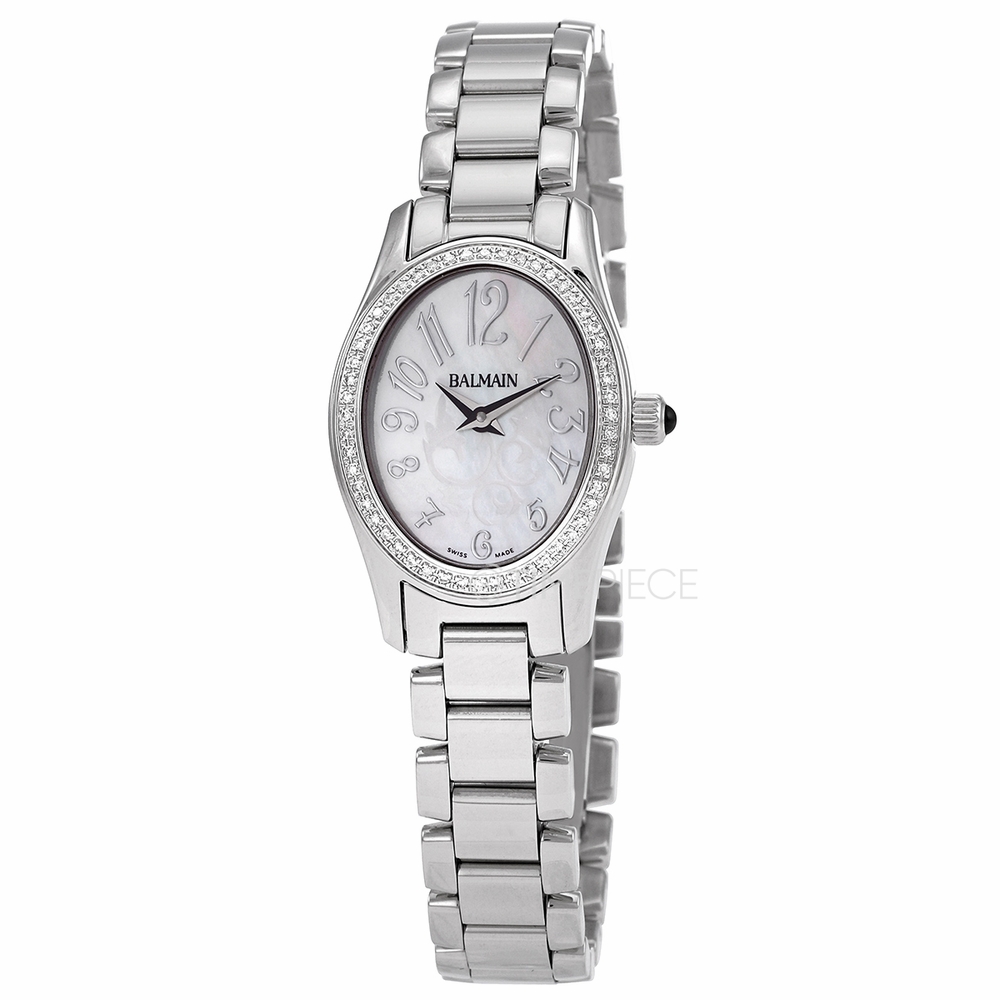 Stainless steel case with a stainless steel bracelet. Fixed stainless steel bezel set with diamonds. Mother of pearl dial with silver-tone hands and Arabic numeral hour markers. Dial Type: Analog. Quartz movement. Scratch resistant sapphire crystal. Pull / push crown. Solid case back. Oval case shape. Case dimensions: 29.5 mm x 19.5 mm. Jewelry clasp. Water resistant at 50 meters / 165 feet. Functions: hour, minute. Madrigal Series. Dress watch style. Watch label: Swiss Made. Balmain Madrigal Quartz Diamond Mother of Pearl Ladies Watch B26753383.