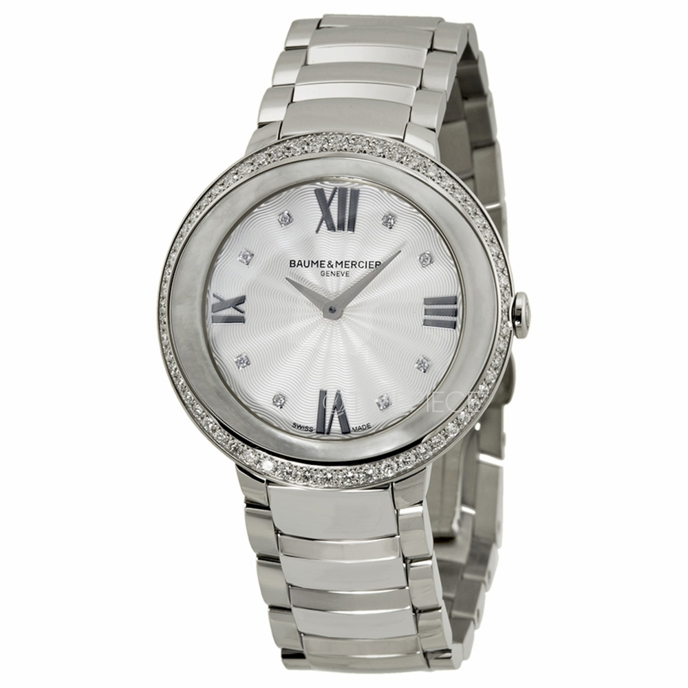 Silver-tone stainless steel case with a silver-tone stainless steel bracelet. Fixed silver-tone mother of pearl set with 61 diamonds bezel. Silver dial with silver-tone dauphine rhodium-plated hands and diamond hour markers. Roman numerals mark the 3, 6, 9 and 12 o'clock positions. Dial Type: Analog. ETA Caliber F05.101 quartz movement. Scratch resistant sapphire crystal. Pull / push crown. Solid case back. Round case shape. Case size: 34 mm. Deployment clasp. Water resistant at 30 meters / 100 feet. Functions: hour, minute. Dress watch style. Watch label: Swiss Made. Baume and Mercier Promesse Silver Dial Stainless Steel Ladies Watch 10199.