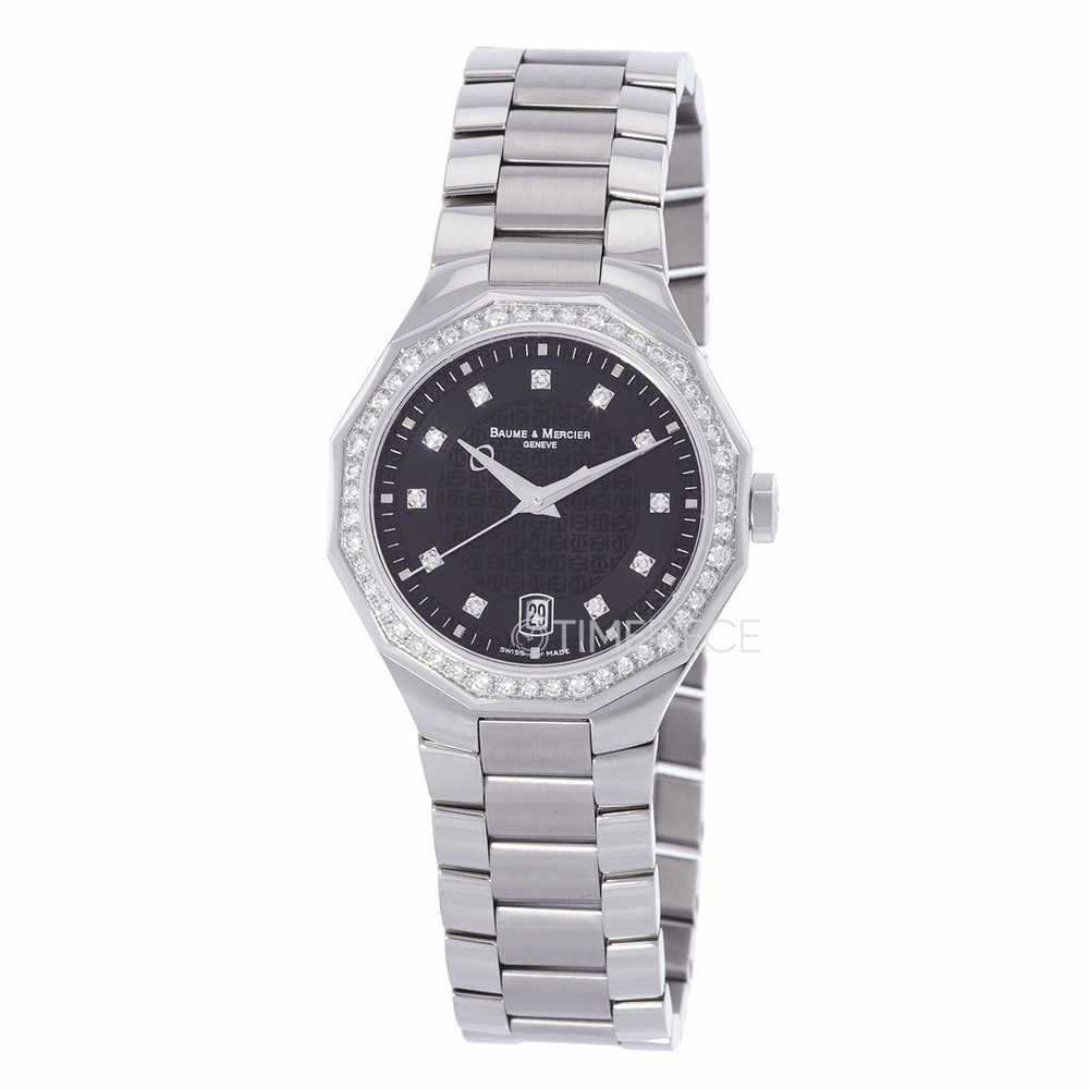 Stainless steel case with a stainless steel bracelet. Diamond accent bezel. with silver-tone hands and diamond hour markers. Minute markers around the outer rim. Date display appears at the 6 o'clock position. Quartz movement. Scratch resistant sapphire crystal. Case diameter: 28 mm. Deployment clasp. Water resistant at 50 meters/ 165 feet. Functions: hours, minutes, seconds, calendar. Baume and Mercier Riviera Stainless Steel Ladies Watch MOA8716. Item Variations: MOA8716, M0A08716, 8716, 08716