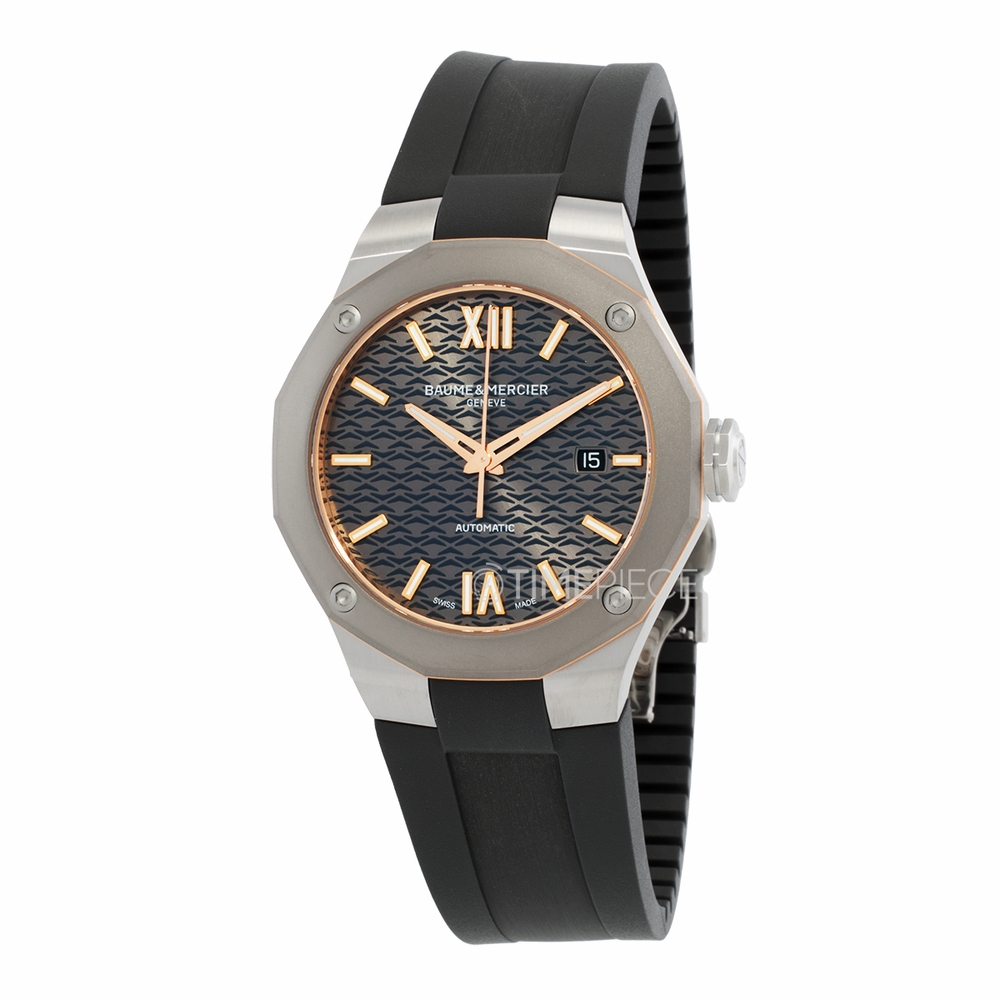 Stainless steel case with a grey silicone strap. Fixed grey titanium bezel. Grey dial with luminous rose gold-tone hands and index hour markers. Roman numerals appear at the 6 and 12 o'clock positions. Dial Type: Analog. Luminescent hands and markers. Date display at the 3 o'clock position. Sellita caliber SW200 automatic movement, containing 26 Jewels, bitting at 28800 vph, and has a power reserve of approximately 38 hours. Scratch resistant sapphire crystal. Transparent case back. Round case shape. Case size: 42 mm.Case thickness: 9.57 mm. Deployment clasp with a push button release. Water resistant at 100 meters / 330 feet. Functions: date, hour, minute, second. Riviera Series. Sport watch style. Watch label: Swiss Made. Baume et Mercier Riviera Automatic Grey Dial Mens Watch M0A10660.