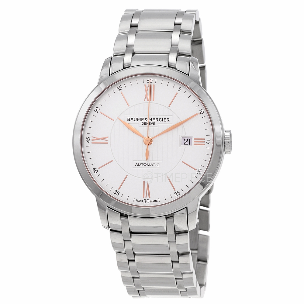 Stainless steel case with a stainless steel bracelet. Fixed stainless steel bezel. White dial with rose gold-tone hands and index hour markers. Roman numerals appear at the 3, 6, 9 and 12 o'clock positions. Arabic numeral minute markers (at 5 minute intervals). Minute markers around the outer rim. Dial Type: Analog. Date display at the 3 o'clock position. Automatic movement. Scratch resistant sapphire crystal. Pull / push crown. Transparent case back. Round case shape. Case size: 36 mm. Case thickness: 8.95 mm. Band width: 21 mm. Deployment clasp. Water resistant at 50 meters / 165 feet. Functions: date, hour, minute, second. Classima Series. Dress watch style. Watch label: Swiss Made. Baume et Mercier Classima Automatic White Dial Mens Watch M0A10374.