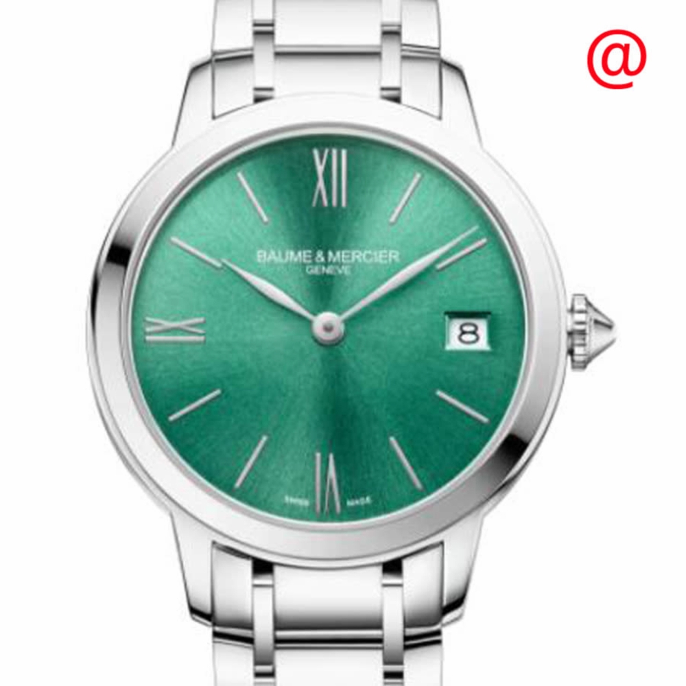 Stainless steel case with a stainless steel bracelet. Fixed stainless steel bezel. Green dial with rhodium-plated hands and index hour markers. Roman numerals appear at the 6, 9 and 12 o'clock positions. Dial Type: Analog. Date display at the 6 o'clock position. Ronda 704 quartz movement. Scratch resistant sapphire crystal. Pull / push crown. Solid case back. Round case shape. Case size: 31 mm. Case thickness: 5.95 mm. Band width: 20 mm. Triple fold over clasp. Water resistant at 50 meters / 165 feet. Functions: date, hour, minute, second. Classima Series. Dress watch style. Watch label: Swiss Made. Baume et Mercier Classima Quartz Green Dial Ladies Watch M0A10609.
