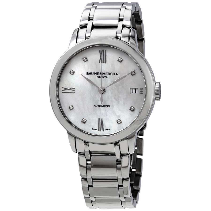 Stainless steel case with a stainless steel bracelet. Fixed stainless steel bezel. Mother of pearl dial with silver-tone leaf-style hands and diamond hour markers. Roman numerals mark the 3, 6, 9 and 12 o'clock positions. Dial Type: Analog. Date display at the 3 o'clock position. ETA caliber 2892-A2 automatic movement, based upon ETA 2890, containing 21 Jewels, bitting at 28800 vph, and has a power reserve of approximately 42 hours. Scratch resistant sapphire crystal. Pull / push crown. Transparent case back. Round case shape. Case size: 34 mm. Case thickness: 8.15 mm. Triple fold over clasp with a push button release. Water resistant at 50 meters / 165 feet. Functions: date, hour, minute, second. Classima Series. Dress watch style. Watch label: Swiss Made. Baume et Mercier Classima Automatic Diamond Ladies Watch 10496.