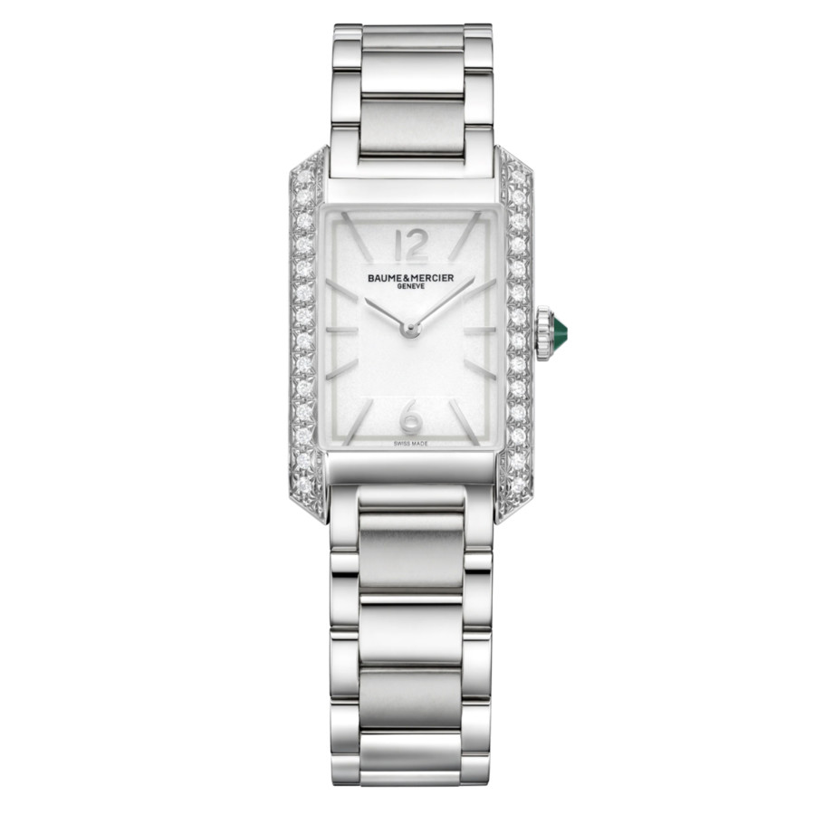 Stainless steel case with a 1 stainless steel bracelet. Fixed stainless steel bezel set with diamonds. Silver dial with silver-tone hands and index hour markers. Arabic numerals appear at the 6 and 12 o'clock positions. Dial Type: Analog. Quartz movement. Scratch resistant sapphire crystal. Pull / push crown. Solid case back. Rectangle case shape. Case dimensions: 35 mm x 22 mm. Case thickness: 7 mm. Fold over clasp with a double push button release. Water resistant at 50 meters / 165 feet. Functions: hour, minute. Hampton Series. Dress watch style. Watch label: Swiss Made. Baume et Mercier Hampton Quartz Diamond Silver Dial Ladies Watch 10631.