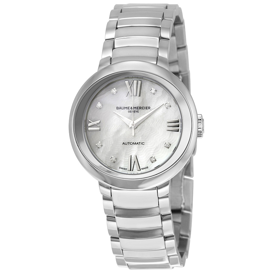 Stainless steel case with a stainless steel bracelet. Fixed stainless steel bezel. Mother of pearl dial with silver-tone dauphine hands and diamond hour markers. Roman numerals mark the 3, 6, 9 and 12 o'clock positions. Dial Type: Analog. ETA caliber 2671 automatic movement, containing 25 Jewels, bitting at 28800 vph, and has a power reserve of approximately 38 hours. Scratch resistant sapphire crystal. Pull / push crown. Solid case back. Round case shape. Case size: 30 mm. Case thickness: 9.8 mm. Fold over clasp with a push button release. Water resistant at 50 meters / 165 feet. Functions: hour, minute, second. Luxury watch style. Watch label: Swiss Made. Item Variations: A10238, MOA10238. Baume and Mercier Promesse Automatic Mother of Pearl Diamond Dia Ladies Watch 10238.