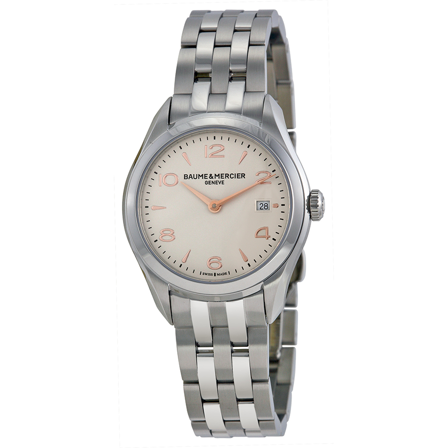 Silver-tone stainless steel case with a silver-tone stainless steel bracelet. Fixed silver-tone stainless steel bezel. Silver dial with rose gold-tone dauphine-style shape hands and alternating Arabic numeral and index hour markers. Minute markers around the outer rim. Dial Type: Analog. Date display at the 3 o'clock position. Ronda Caliber 784 quartz movement. Scratch resistant sapphire crystal. Pull / push crown. Solid case back. Round case shape, case size: 30 mm, case thickness: 7.65 mm. Band width: 15 mm, band length: 8 inches. Deployment clasp. Water resistant at 50 meters / 165 feet. Functions: date, hour, minute. Luxury watch style. Watch label: Swiss Made. Item Variations: MOA10175, M0A10175, 10175. Baume and Mercier Clifton Silver Dial Ladies Watch 10175.