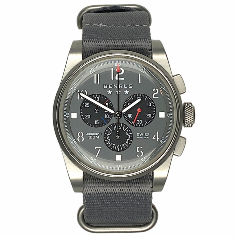 Silver-tone stainless steel case with a grey nylon strap. Fixed silver-tone stainless steel bezel. Grey dial with silver-tone hands and Arabic numeral & index hour markers. Minute markers around the outer rim. Dial Type: Analog. Luminescent hands and markers. Chronograph - three sub-dials displaying: 60 second, 30 minute and 12 hour. Quartz movement. Solid case back. Round case shape, case size: 41 mm. Buckle clasp. Water resistant at 100 meters / 330 feet. Functions: chronograph, hour, minute, second. Air Chief II Series. Casual watch style. Watch label: Swiss Made. Benrus Air Chief II Chronograph Quartz Grey Dial Mens Watch AC4-SB-G-NG.
