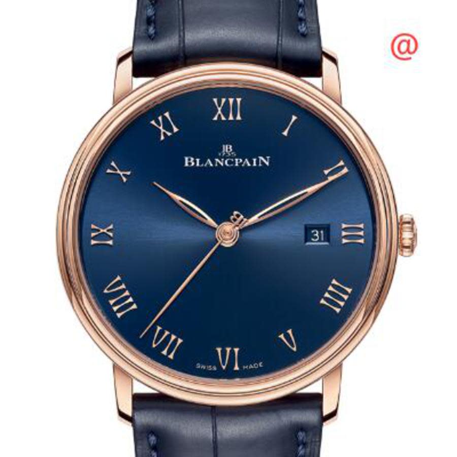 18kt rose gold case with a blue alligator band. Fixed 18kt rose gold bezel. Blue dial with rose gold-tone hands and Roman numeral hour markers. Dial Type: Analog. Date display at the 3 o'clock position. Blancpain Calibre 1151 Automatic movement, containing 28 Jewels, composed of 210 parts, bitting at 21600 vph, and has a power reserve of approximately 100 hours. Scratch resistant sapphire crystal. Pull / push crown. Transparent case back. Round case shape, case size: 40 mm, case thickness: 8.7 mm. Deployant buckle clasp. Water resistant at 30 meters / 99 feet. Functions: date, hour, minute, second. Additional Info: original box, international warranty card, manual (complete accessories). Classique Series. Luxury watch style. Watch label: Swiss Made. Blancpain Classique Hand Wind Blue Dial Mens Watch 6651 3640 55B.