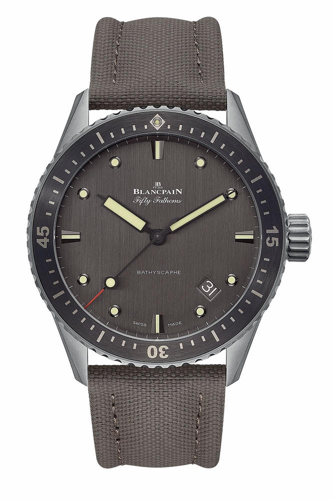 Grey titanium case with a grey canvas strap. Uni-directional rotating grey titanium bezel with a black ceramic insert. Grey dial with luminous black hands and index hour markers. Minute markers around the outer rim. Dial Type: Analog. Luminescent hands and markers. Date display between the 4 and 5 o'clock positions. Blancpain calibre 1315DD automatic movement, containing 37 Jewels, bitting at 28800 vph, and has a power reserve of approximately 120 hours. Scratch resistant sapphire crystal. Screw down crown. Transparent case back. Round case shape. Case size: 43 mm. Case thickness: 13.45 mm. Band width: 23 mm. Tang clasp. Water resistant at 30 meters / 100 feet. Functions: date, day, hour, minute, second. Fifty Fathoms Series. Dress watch style. Watch label: Swiss Made. Blancpain Fifty Fathoms Automatic Grey Dial Mens Watch 5000 1210 G52A.