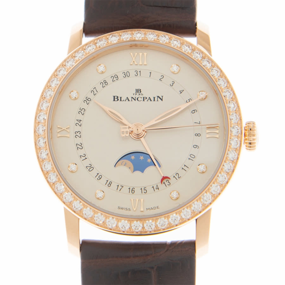 Rose gold-tone 18kt rose gold case with a brown alligator band. Fixed rose gold-tone bezel with diamond set18kt rose gold. Beige dial with rose gold-tone hands and diamond hour markers. Dial Type: Analog. Date display around the outer rim. One subdial displaying: moonphase. Blancpain Calibre 913QL.P Automatic movement, containing 29 Jewels, bitting at 21600 vph, and has a power reserve of approximately 40 hours. Scratch resistant sapphire crystal. Transparent see through case back. Round case shape, case size: 33 mm. Buckle clasp. Water resistant at 30 meters / 100 feet. Functions: moon phase, date, hour, minute, second. Additional Info: original box, international warranty card, manual (complete accessories). Villeret Series. Luxury watch style. Watch label: Swiss Made. Blancpain Villeret Automatic Diamond Ladies Watch 6126 2987 55A.