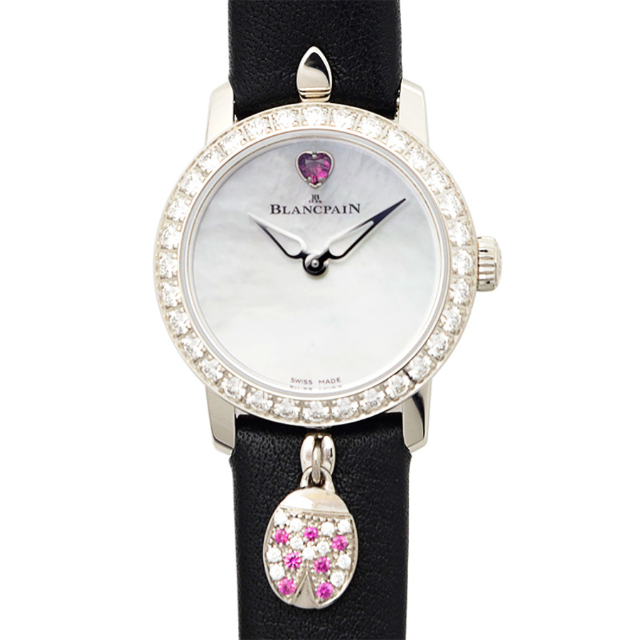 18kt white gold case with a black leather strap. Fixed 18kt white gold bezel with diamond set. Mother of pearl dial with silver-tone hands. Dial Type: Analog. Blancpain Calibre 615 Automatic movement, containing 29 Jewels, composed of 180 parts, bitting at 21600 vph, and has a power reserve of approximately 38 hours. Scratch resistant sapphire crystal. Pull / push crown. Round case shape, case size: 21.50 mm, case thickness: 8.23 mm. Band width: 11 mm. Buckle clasp. Water resistant at 30 meters / 100 feet. Functions: hour, minute. Additional Info: 0.57 carat (s). Ladybird Slim Series. Luxury watch style. Watch label: Swiss Made. Blancpain Ladybird Slim Automatic Ladies Watch 0063D-1954-63A.