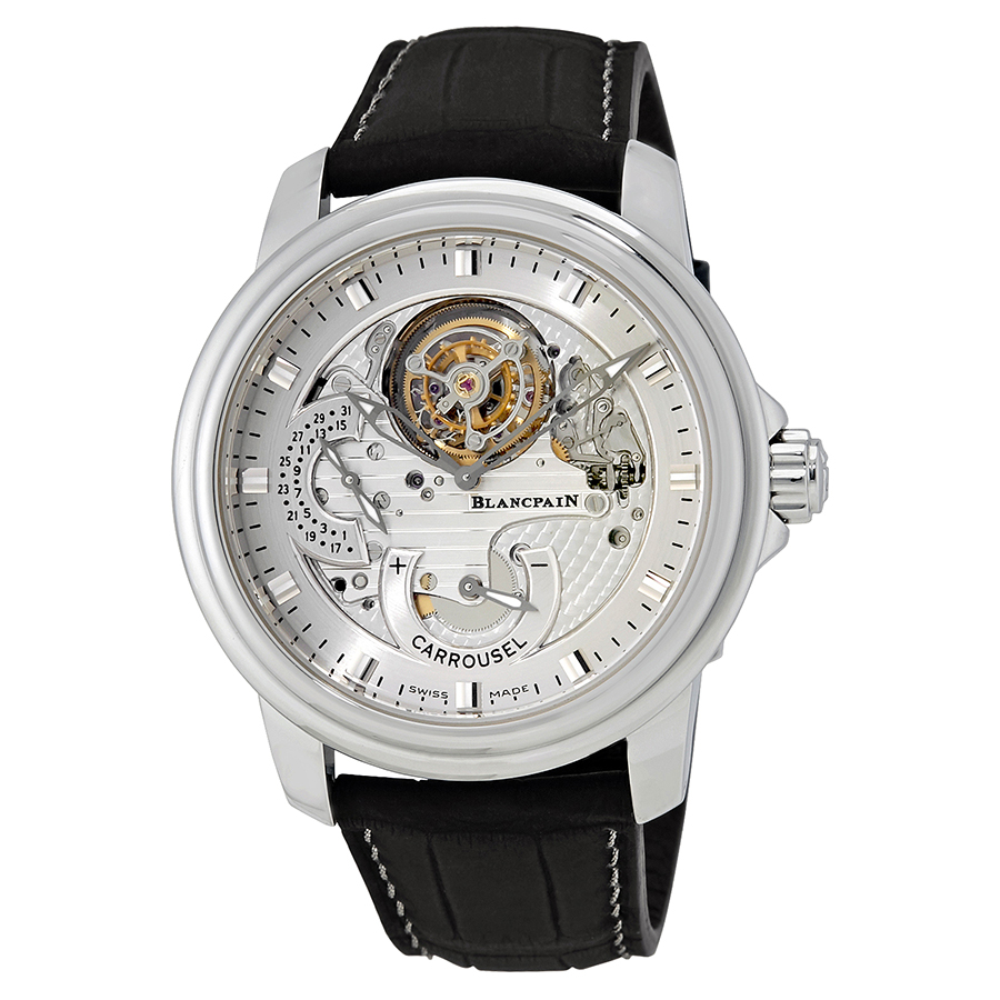 Silver-tone platinum case with a black leather strap. Fixed silver-tone platinum bezel. Silver skeleton dial with silver-tone skeleton hands and index hour markers. Minute markers around the outer rim. Dial Type: Analog. Luminescent hands and markers. Date display at the 9 o'clock position. Two - date and power reserve subdials. Blancpain Calibre 225 Automatic movement, containing 36 Jewels, composed of 263 parts, bitting at 21600 vph, and has a power reserve of approximately 120 hours. Scratch resistant sapphire crystal. Screw down crown. Transparent case back. Round case shape. Case size: 43.50 mm. Tang clasp. Water resistant at 100 meters / 330 feet. Functions: date, hour, minute, power reserve indicator, flying carrousel. Additional Info: limited to 288. Luxury watch style. Watch label: Swiss Made. Blancpain Le Brassus Platinum One Minute Flying Carrousel Mens Watch 2253-4034-53B.