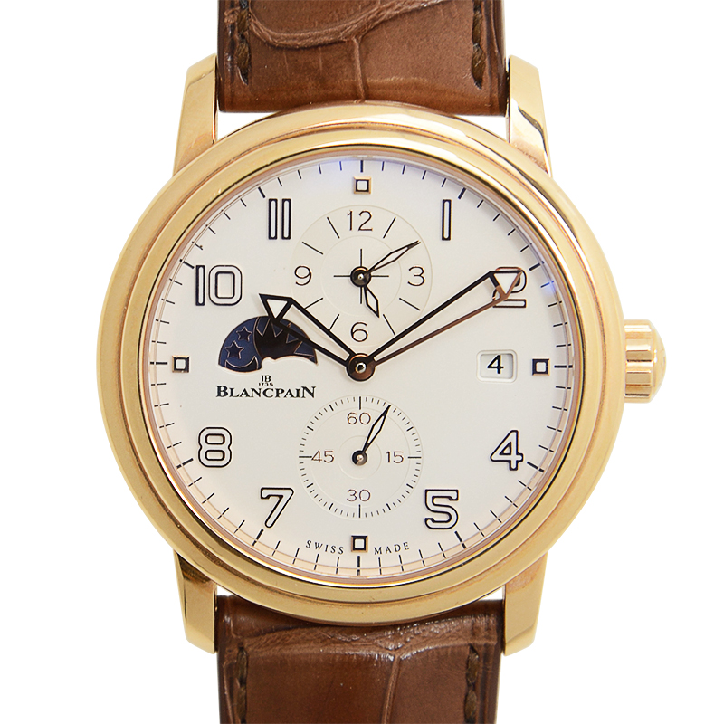 Gold-tone 18kt rose gold case with a brown alligator band. Fixed gold-tone bezel. Two-tone dial with gold-tone hands and Arabic numeral hour markers. Minute markers around the outer rim. Dial Type: Analog. Luminescent hands and markers. Date display at the 3 o'clock position. Three sub-dials displaying: 60 second, 12 hour, day/night indicator. Blancpain Calibre 5L60 Automatic movement, containing 30 Jewels, composed of 253 parts, bitting at 21600 vph, and has a power reserve of approximately 100 hours. Scratch resistant sapphire crystal. Transparent case back. Round case shape, case size: 40 mm. Tang clasp. Water resistant at 100 meters / 330 feet. Functions: date, second time zone, hour, minute, second, day/night indicator. Leman Series. Luxury watch style. Watch label: Swiss Made. Item Variations: 2860 3642 53B, 2860.3642.53B, 2860364253B. Blancpain Leman Dual Time Zone Automatic Mens Watch 2860-3642-53B.