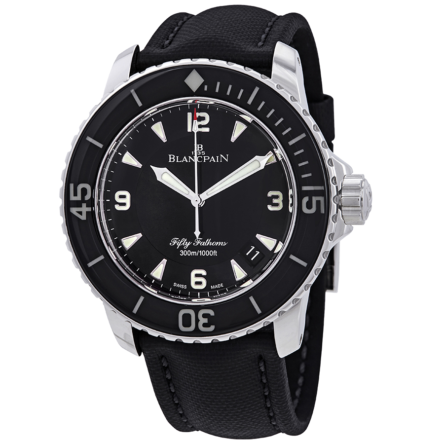Stainless steel case with a black sail canvas strap. Uni-directional rotating coin edge stainless steel bezel with a black (sapphire coated) top ring. Black dial with luminous silver-tone hands and index hour markers. Arabic numerals mark the 3, 6, 9, and 12 o'clock positions. Minute markers around the outer rim. Dial Type: Analog. Luminescent hands and markers. Date display between the 4 and 5 o'clock positions. Blancpain calibre 1315 automatic movement, containing 35 Jewels, composed of 227 parts, and has a power reserve of approximately 120 hours. Scratch resistant sapphire crystal. Screw down crown. Solid case back. Round case shape. Case size: 45 mm. Case thickness: 15.5 mm. Band width: 23 mm. Tang clasp. Water resistant at 300 meters / 1000 feet. Functions: date, hour, minute, second. Fifty Fathoms Automatique Series. Luxury watch style. Watch label: Swiss Made. Blancpain Fifty Fathoms Automatique Black Dial Mens Watch 5015-1130-52A.