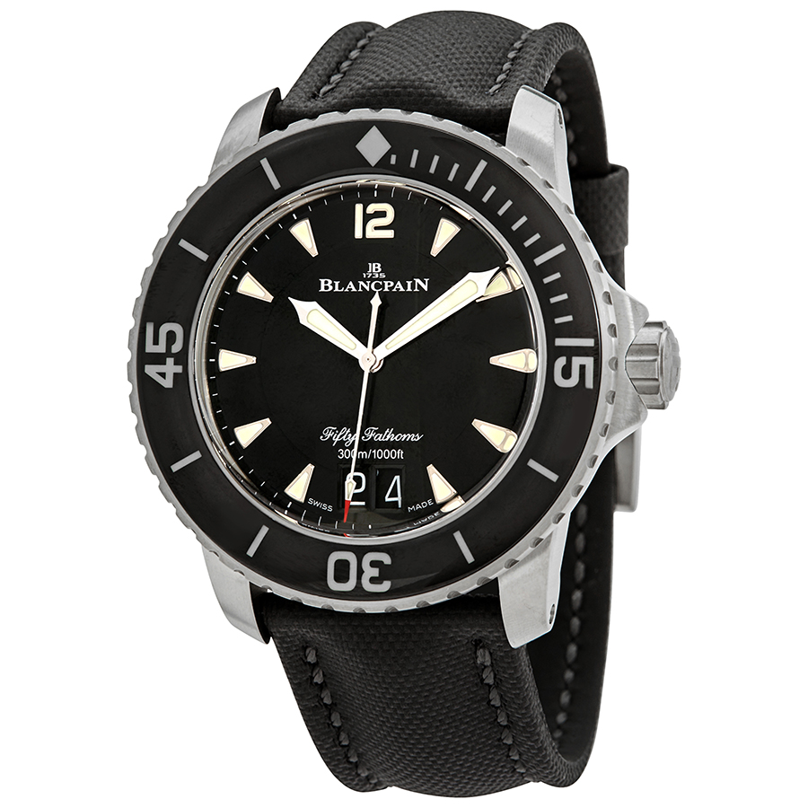 Grey brushed titanium case with a black fabric strap. Uni-directional rotating coin edge grey titanium bezel with a black ceramic (count-up elapsed time) top ring. Black dial with luminous silver-tone hands and index hour markers. Arabic numeral appears at the 12 o'clock position. Minute markers around the outer rim. Dial Type: Analog. Luminescent hands and markers. Date display at the 6 o'clock position. Blancpain Calibre 6918B Automatic movement, containing 44 Jewels, bitting at 28800 vph, and has a power reserve of approximately 120 hours. Scratch resistant sapphire crystal. Screw down crown. Transparent case back. Round case shape, case size: 45 mm, case thickness: 16.27 mm. Band width: 23 mm. Tang clasp. Water resistant at 300 meters / 1000 feet. Functions: big date, hour, minute, second. Additional Info: n05050o12b030nb52a. Fifty Fathoms Series. Dive watch style. Watch label: Swiss Made. Blancpain Fifty Fathoms Grande Date Automatic Black Dial Mens Watch 5050-12B30-B52A.