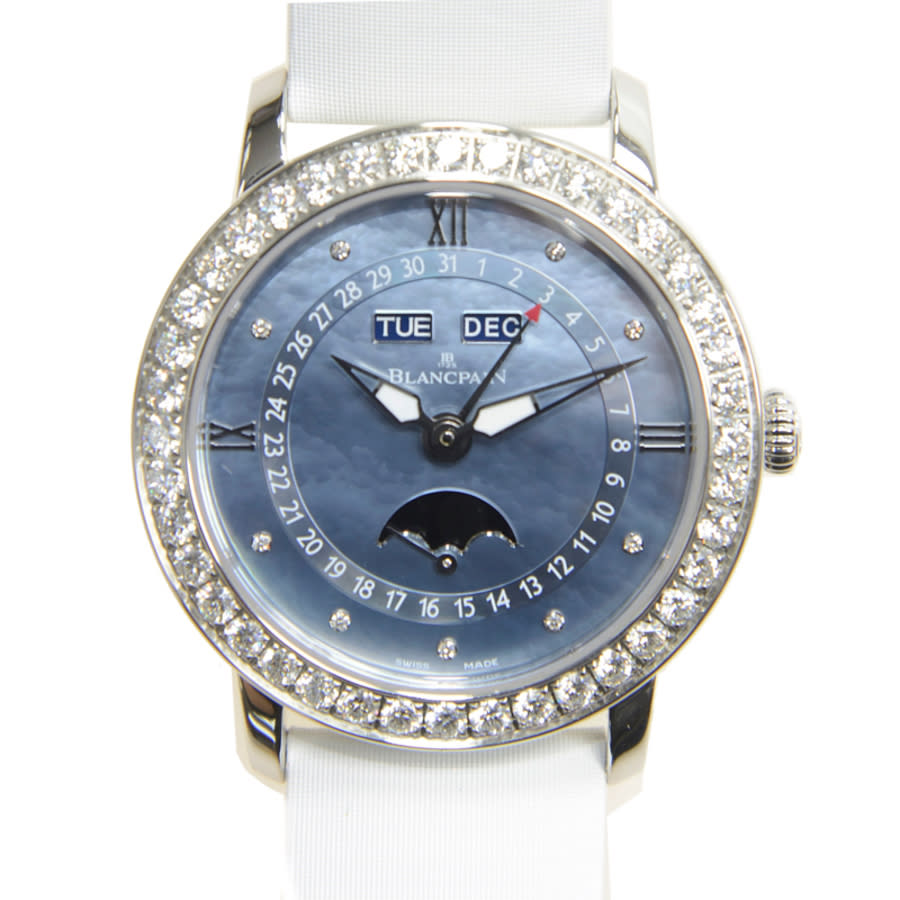 Stainless steel case with a white satin strap. Fixed bezel with diamond set. Blue mother of pearl dial with diamond hour markers. Dial Type: Analog. Complete calendar. One subdial displaying: moonphase/small second. Blancpain Calibre 6763 Automatic movement, containing 30 Jewels, composed of 261 parts, bitting at 21600 vph, and has a power reserve of approximately 100 hours. Scratch resistant sapphire crystal. Transparent see through case back. Round case shape, case size: 35 mm, case thickness: 10.5 mm. Band width: 18 mm. Deployment clasp. Water resistant at 30 meters / 100 feet. Functions: full calendar, moon phase, month, date, day, hour, minute, small second. Women Complete Calendar Moon Phase Series. Luxury watch style. Watch label: Swiss Made. Blancpain Women Complete Calendar Moon Phase Automatic Diamond Ladies Watch 3663-4654L-52B.