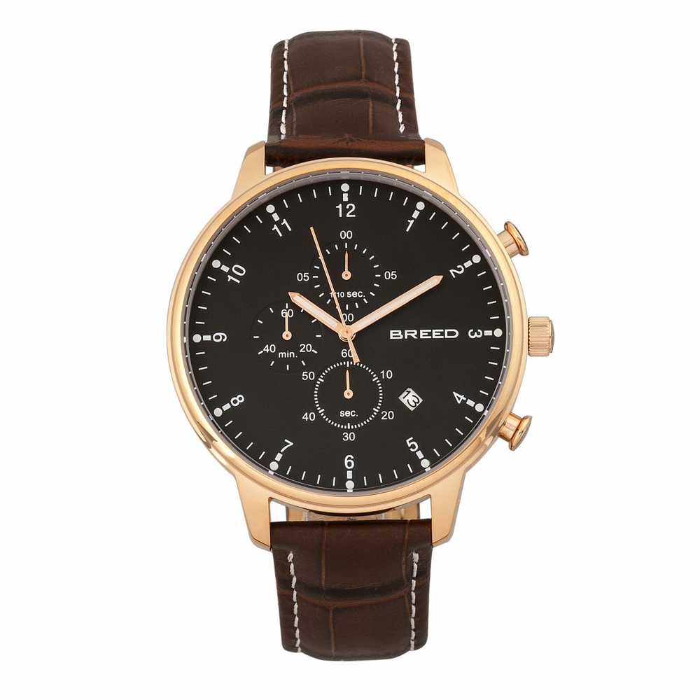 Rose gold-tone alloy case with a brown genuine leather strap. Fixed rose gold-tone alloy bezel. Black dial with gold-tone hands and Arabic numeral hour markers. Minute markers around the outer rim. Dial Type: Analog. Luminescent hands. Date display between 4 and 5 o'clock position. Chronograph - sub-dials displaying: three - 60 second, 60 minute and 1/10th of a second. Quartz movement. Scratch resistant mineral crystal. Pull / push crown. Solid case back. Round case shape, case size: 45 mm, case thickness: 11 mm. Band width: 20 mm. Buckle clasp. Water resistant at 50 meters / 165 feet. Functions: chronograph, date, hour, minute, second. Sport watch style. Watch label: Japan Movt. Item Variations: BRD7806. Breed Holden Chronograph Black Dial Mens Watch 7806.