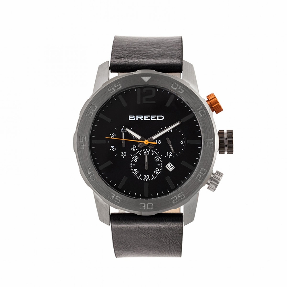Black stainless steel case with a black genuine leather strap. Black stainless steel bezel. Black dial with Arabic numeral and index hour markers. Minute markers around the outer rim. Dial Type: Analog. Luminescent hands. Date display between 4 and 5 o'clock position. Quartz movement. Scratch resistant mineral crystal. Pull / push crown. Solid case back. Round case shape, case size: 46 mm, case thickness: 13 mm. Band width: 24 mm. Buckle clasp. Water resistant at 50 meters / 165 feet. Functions: chronograph, date, hour, minute, second. Sport watch style. Watch label: Japan Movt. Item Variations: BRD7206. Breed Manuel Chronograph Black Dial Mens Watch 7206.