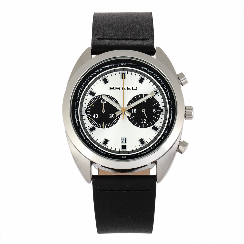 Silver-tone alloy case with a black genuine leather strap. Fixed silver-tone alloy bezel. Silver-tone dial with silver-tone hands and index hour markers. Minute markers around the outer rim. Dial Type: Analog. Luminescent hands and markers. Date display at the 6 o'clock position. Quartz movement. Scratch resistant mineral crystal. Pull / push crown. Solid case back. Round case shape, case size: 42 mm, case thickness: 11 mm. Band width: 22 mm. Buckle clasp. Water resistant at 50 meters / 165 feet. Functions: chronograph, date, hour, minute, second. Sport watch style. Watch label: Japan Movt. Item Variations: BRD8504. Breed Racer Chronograph Quartz Silver Dial Mens Watch 8504.