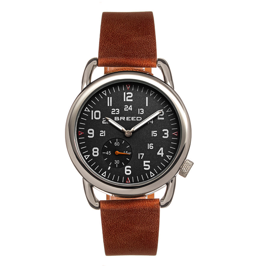 Band Color: Brown Genuine Leather; Band Width: 20mm near case; 18mm near clasp/buckle; Bezel Color: Silver; Case: Silver + Circle-Shaped; Case Finish: Brushed + Alloy; Case Thickness: 11mm; Case Width: 42mm; 45mm with Crown; Clasp / Buckle: Strap Buckle; Dial: Black + Analog; Hand Color: Silver; Movement: Japanese + Quartz; Time Zones: Single; Water Resistance: 5 ATM. Silver-tone alloy case with a brown genuine leather strap. Fixed silver-tone alloy bezel. Black dial with silver-tone hands and Arabic numeral & Roman numeral hour markers. Minute markers around the outer rim. Dial Type: Analog. Luminescent hands. Quartz movement. Scratch resistant mineral crystal. Pull / push crown. Solid case back. Round case shape, case size: 42 mm, case thickness: 11 mm. Band width: 20 mm, band length: 9 inches. Buckle clasp. Water resistant at 50 meters / 165 feet. Functions: hour, minute, second. Regulator Series. Casual watch style. Breed Regulator Quartz Black Dial Mens Watch BRD8802.