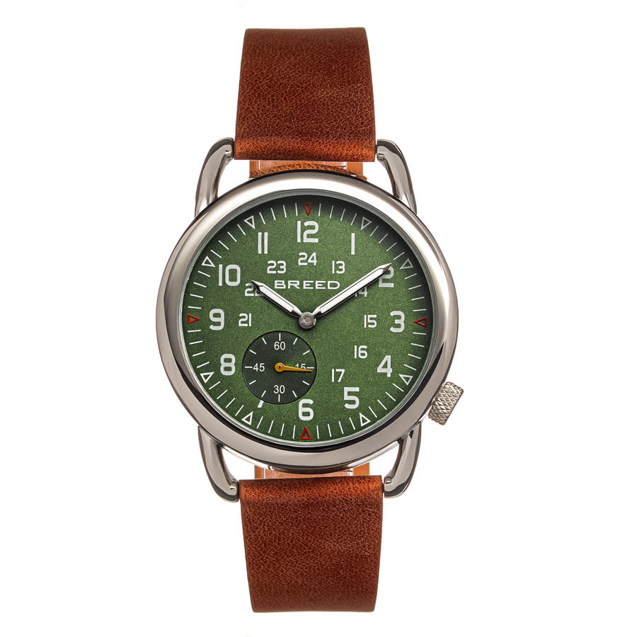 Band Color: Brown Genuine Leather; Band Width: 20mm near case; 18mm near clasp/buckle; Bezel Color: Silver; Case: Silver + Circle-Shaped; Case Finish: Brushed + Alloy; Case Thickness: 11mm; Case Width: 42mm; 45mm with Crown; Clasp / Buckle: Strap Buckle; Dial: Green + Analog; Hand Color: Silver; Movement: Japanese + Quartz; Time Zones: Single; Water Resistance: 5 ATM. Silver-tone alloy case with a brown genuine leather strap. Fixed silver-tone alloy bezel. Green dial with silver-tone hands and Arabic numeral & Roman numeral hour markers. Minute markers around the outer rim. Dial Type: Analog. Luminescent hands. Quartz movement. Scratch resistant mineral crystal. Pull / push crown. Solid case back. Round case shape, case size: 42 mm, case thickness: 11 mm. Band width: 20 mm, band length: 9 inches. Buckle clasp. Water resistant at 50 meters / 165 feet. Functions: hour, minute, second. Regulator Series. Casual watch style. Breed Regulator Quartz Green Dial Mens Watch BRD8803.