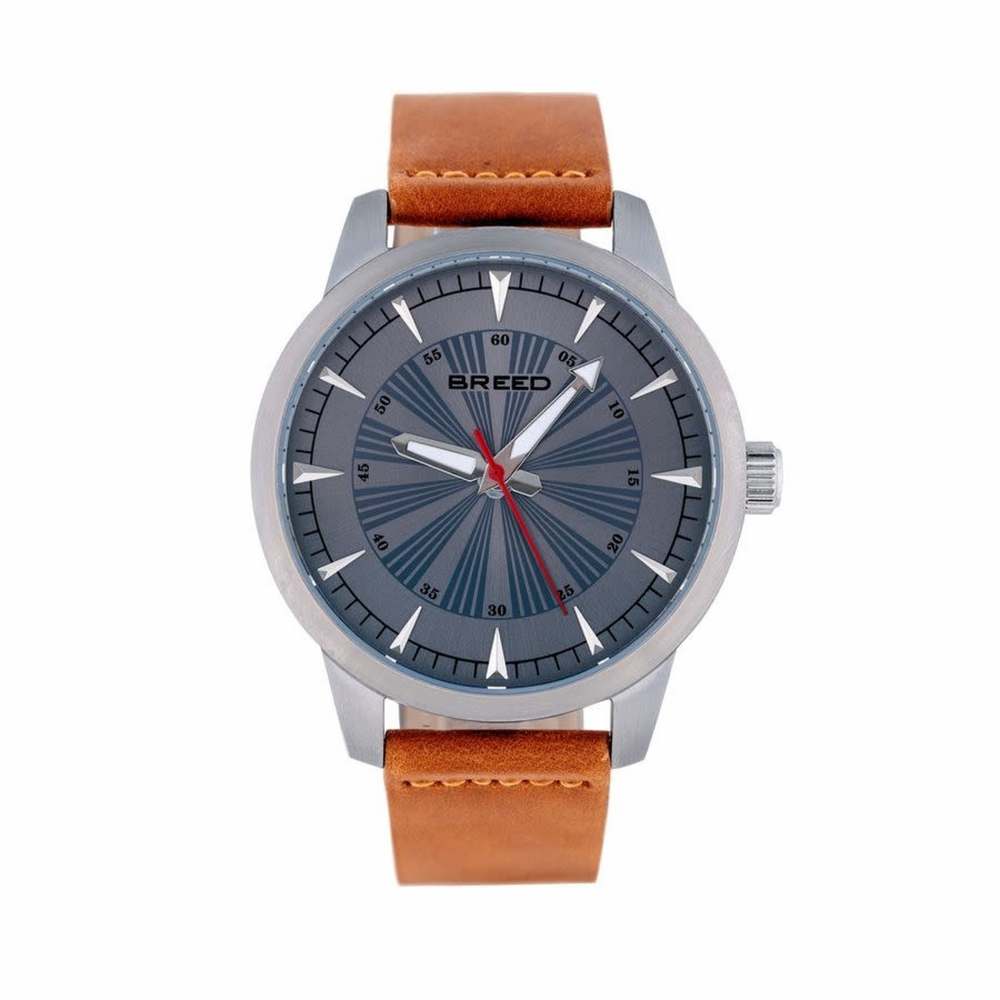 Band Color: Brown Genuine Leather; Band Width: 20mm near case; 18mm near clasp/buckle; Bezel Color: Silver; Case: Silver + Circle-Shaped; Case Finish: Polished + Stainless Steel; Case Thickness: 11mm; Case Width: 43mm; 47mm with Crown; Clasp / Buckle: Strap Buckle; Dial: Grey + Analog; Hand Color: Silver; Movement: Japanese + Quartz; Time Zones: Single; Water Resistance: 5 ATM.