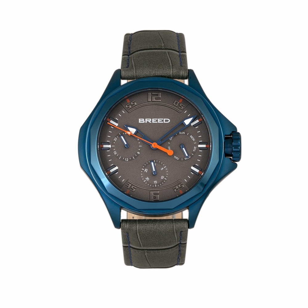 Blue alloy case with a grey genuine leather strap. Fixed blue alloy bezel. Charcoal dial with blue hands and Arabic numeral and index hour markers. Minute markers around the outer rim. Dial Type: Analog. Luminescent hands and markers. Date display at the 3 o'clock position. Three - date, day, 24 hour subdials. Quartz movement. Scratch resistant mineral crystal. Pull / push crown. Solid case back. Unique case shape, case size: 43 mm, case thickness: 12 mm. Band width: 20 mm. Buckle clasp. Water resistant at 30 meters / 100 feet. Functions: date, day, GMT, second time zone, hour, minute, second. Sport watch style. Watch label: Japan Movt. Item Variations: BRD6905. Breed Tempe Mens Watch 6905.