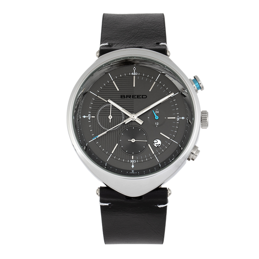 Silver-tone alloy case with a black genuine leather strap. Fixed silver-tone alloy bezel. Grey dial with silver-tone stick-shaped hands and index hour markers. Minute scale around the inner rim. Dial Type: Analog. Luminescent hands. Date display between 4 and 5 o'clock position. Chronograph - three sub-dials displaying: 60 small second, 60 minute & 24 hour. Quartz movement. Scratch resistant mineral crystal. Pull / push crown. Solid case back. Round case shape, case size: 43 mm, case thickness: 11 mm. Band width: 22 mm, band length: 9.29 inches. Buckle clasp. Water resistant at 50 meters / 165 feet. Functions: chronograph, date, hour, minute, second, 24 hour. Tempest Series. Casual watch style. Watch label: Japan Movt. Breed Tempest Chronograph Quartz Grey Dial Mens Watch BRD8603.