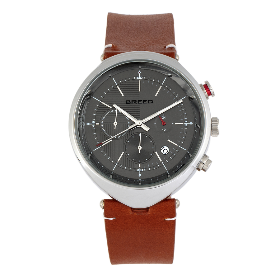 Silver-tone alloy case with a brown genuine leather strap. Fixed silver-tone alloy bezel. Grey dial with silver-tone stich-shaped hands and index hour markers. Minute scale around the inner rim. Dial Type: Analog. Luminescent hands. Date display between 4 and 5 o'clock position. Chronograph - three sub-dials displaying: 60 small second, 60 minute & 24 hour. Quartz movement. Scratch resistant mineral crystal. Pull / push crown. Solid case back. Round case shape, case size: 43 mm, case thickness: 11 mm. Band width: 22 mm, band length: 9.29 inches. Buckle clasp. Water resistant at 50 meters / 165 feet. Functions: chronograph, date, hour, minute, second, 24 hour. Tempest Series. Casual watch style. Watch label: Japan Movt. Breed Tempest Chronograph Quartz Grey Dial Mens Watch BRD8604.