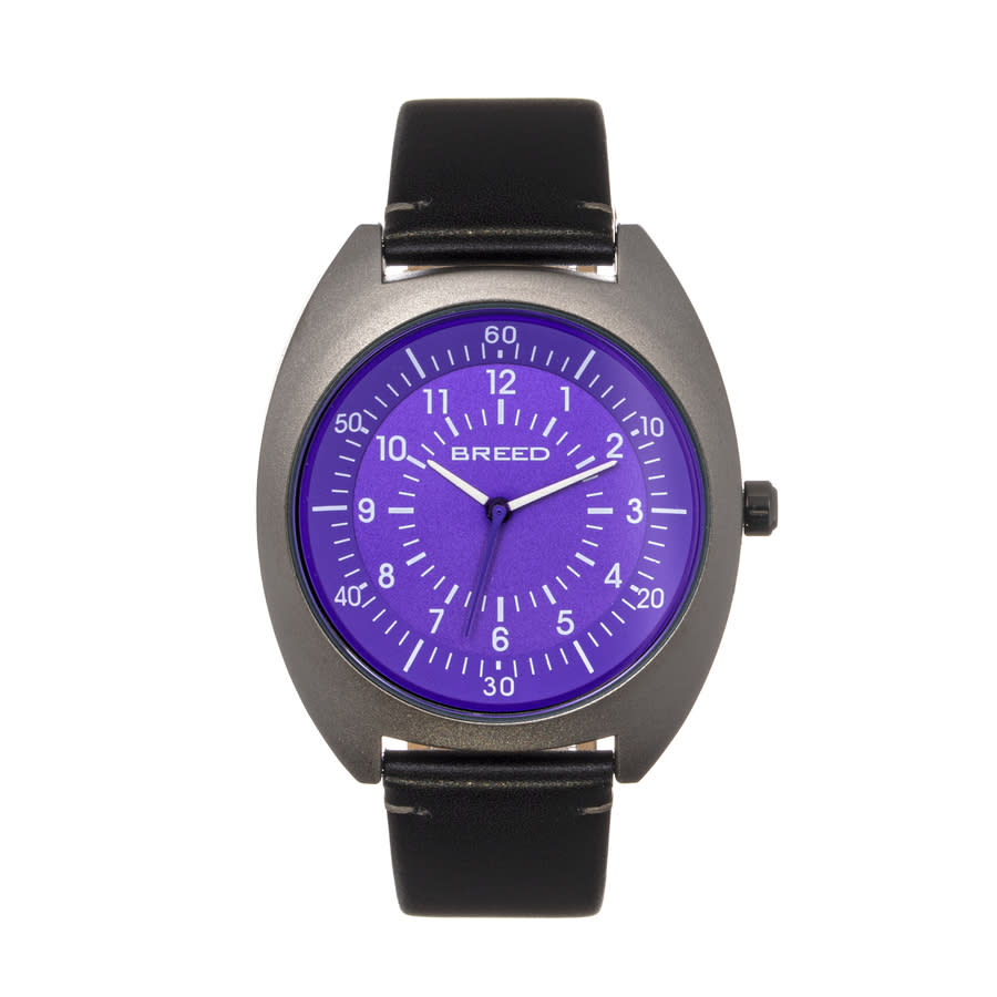 Band Color: Black Genuine Leather; Band Width: 20mm near case; 18mm near clasp/buckle; Bezel Color: Black; Case: Black + Circle-Shaped; Case Finish: Matte + Alloy; Case Thickness: 8mm; Case Width: 43mm; 45mm with Crown; Clasp / Buckle: Strap Buckle; Dial: Purple + Analog; Hand Color: White; Movement: Japanese + Quartz; Time Zones: Single; Water Resistance: 5 ATM.
