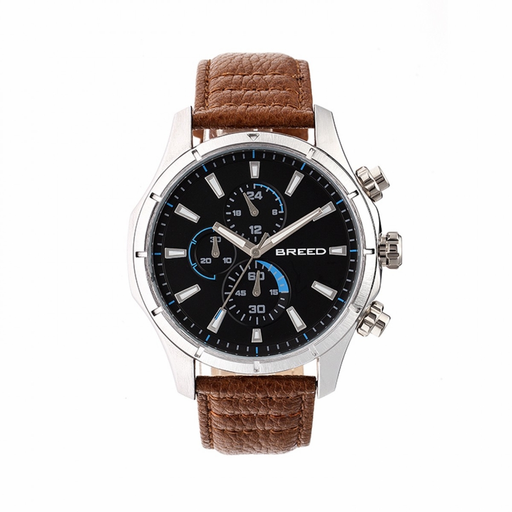 Silver-tone stainless steel case with a brown genuine leather strap. Fixed silver-tone stainless steel bezel. Black dial with silver-tone hands and index hour markers. Minute markers around the outer rim. Dial Type: Analog. Luminescent hands and markers. Quartz movement. Scratch resistant mineral crystal. Pull / push crown. Solid case back. Round case shape, case size: 47 mm, case thickness: 12 mm. Band width: 22 mm. Buckle clasp. Water resistant at 50 meters / 165 feet. Functions: chronograph, GMT, second time zone, hour, minute, second. Sport watch style. Watch label: Japan Movt. Item Variations: BRD6802. Breed Lacroix Chronograph Black Dial Watch 6802.