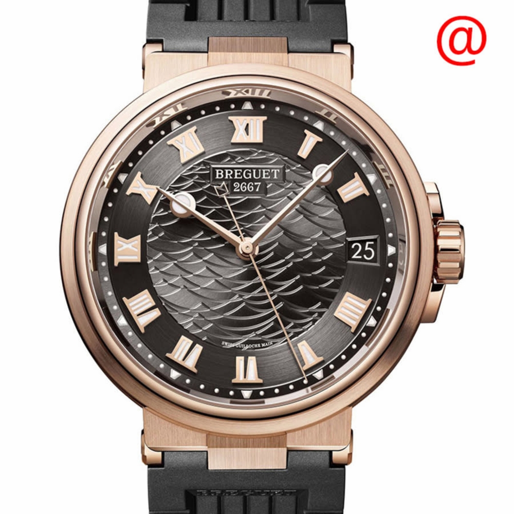 Rose gold-tone 18kt rose gold case with a black rubber strap. Fixed rose gold-tone 18kt rose gold bezel. Grey dial with rose gold-tone hands and Roman numeral hour markers. Minute markers around the outer rim. Dial Type: Analog. Luminescent hands and markers. Date display at the 3 o'clock position. Automatic movement. Scratch resistant sapphire crystal. Screw down crown. Transparent see through case back. Round case shape, case size: 40 mm. Deployment with push button release clasp. Water resistant at 100 meters / 330 feet. Functions: date, hour, minute, second. Additional Info: original box, international warranty card, manual (complete accessories). Marine Series. Luxury watch style. Watch label: Swiss Made. Breguet Marine Automatic Grey Dial Mens Watch 5517BR/G3/5ZU.