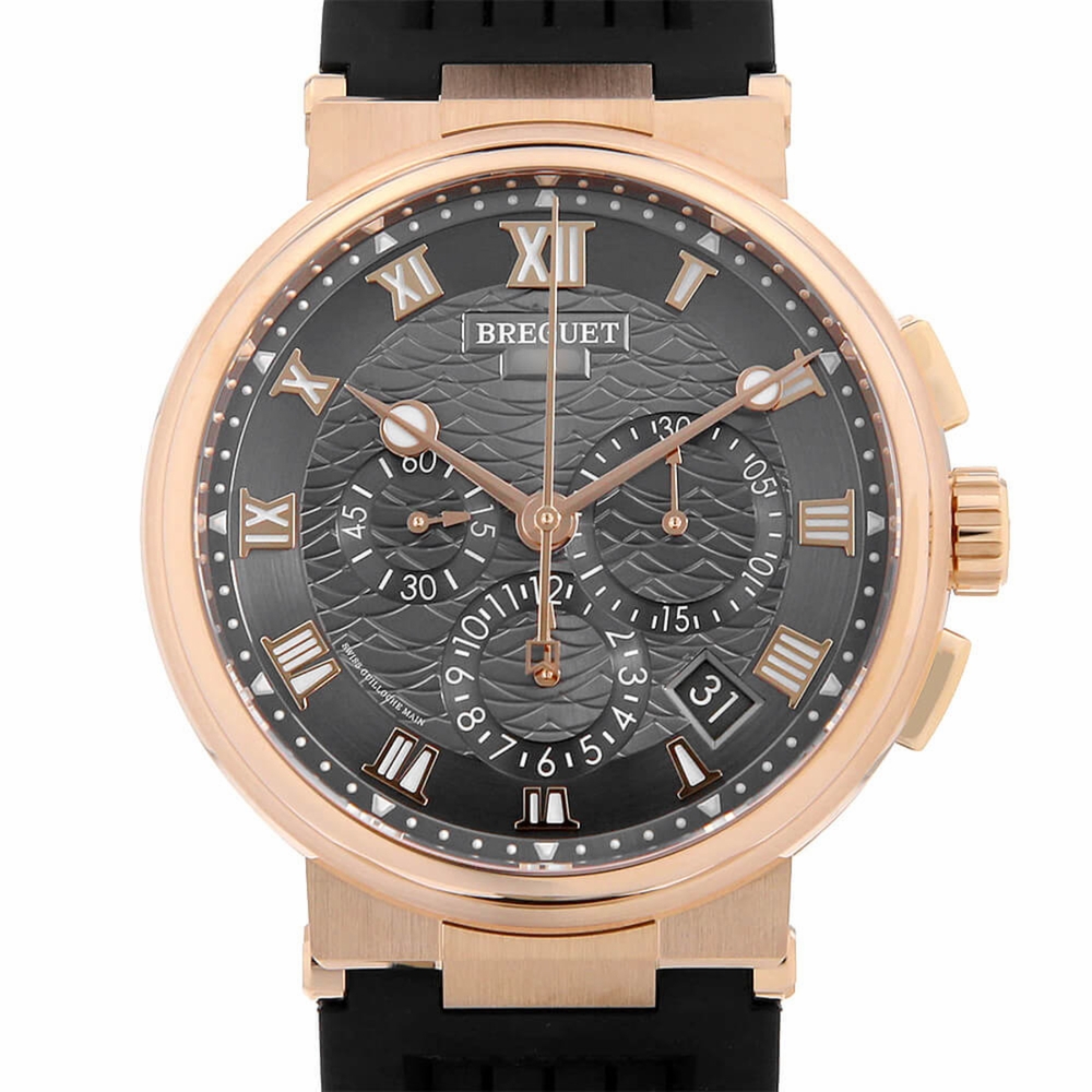 Rose gold-tone 18kt rose gold case with a black rubber strap. Fixed rose gold-tone 18kt rose gold bezel. Grey dial with rose gold-tone hands and Roman numeral hour markers. Minute markers around the outer rim. Dial Type: Analog. Luminescent hands and markers. Date display between 4 and 5 o'clock position. Chronograph - three sub-dials displaying: 60 second, 30 minute and 12 hour. Breguet Calibre 582QA Automatic movement, based upon Breguet 582, containing 28 Jewels, bitting at 28800 vph, and has a power reserve of approximately 48 hours. Scratch resistant sapphire crystal. Transparent see through case back. Round case shape, case size: 42 mm. Water resistant at 100 meters / 330 feet. Functions: chronograph, column wheel, flyback, date, hour, minute, small second. Additional Info: original box, international warranty card, manual (complete accessories). Marine Series. Luxury watch style. Watch label: Swiss Made. Breguet Marine Chronograph Automatic Grey Dial Mens Watch 5527BRG35WV.