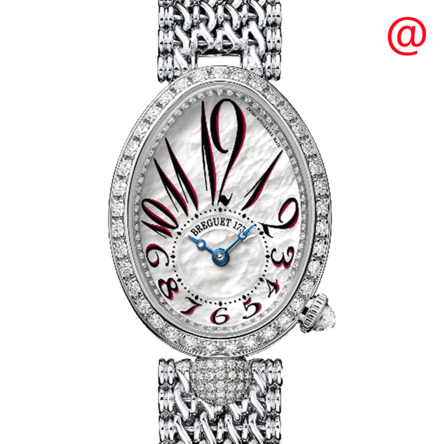 18kt white gold case with a silver-tone satin strap. Fixed bezel with diamond set. White dial with Roman numeral hour markers. Minute markers around the inner rim. Dial Type: Analog. Breguet Calibre 586 Automatic movement, containing 29 Jewels, bitting at 21600 vph, and has a power reserve of approximately 38 hours. Scratch resistant sapphire crystal. Pull / push crown. Transparent (see through) case back. Oval case shape, case size: 33 mm x 24.95 mm, case thickness: 8.6 mm. Deployment clasp. Water resistant at 30 meters / 100 feet. Functions: hour, minute. Reine De Naples Series. Luxury watch style. Watch label: Swiss Made. Breguet Reine de Naples Automatic Diamond White Dial Ladies Watch 8928BB/5P/J20 DD00.