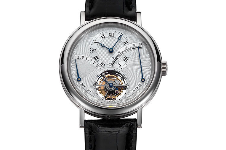 White platinum case with a black leather strap. Fixed white platinum bezel. Silver dial with blue-toned hands and Roman numeral hour markers. Minute markers around the outer rim. Dial Type: Analog. Three sub-dials displaying: tourbillon, power reserve and retrograde 24 hour indicator. Hand wind movement with a 50-hour power reserve. Scratch resistant sapphire crystal. Pull / push crown. Round case shape, case size: 39 mm, case thickness: 10.2 mm. Deployment clasp. Water resistant at 30 meters / 100 feet. Functions: tourbillon, hour, minute, second, power reserve and retrograde 24 hour. Tourbillon Power Reserve Series. Luxury watch style. Watch label: Swiss. Breguet Tourbillon Silver Dial Platinum Black Leather Mens Watch 3657PT129V6.