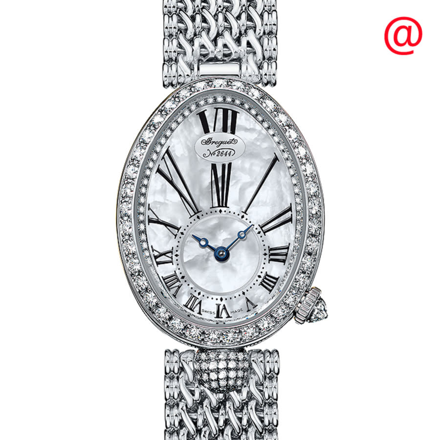 18kt white gold case with a 18kt white gold bracelet. Fixed bezel set with diamonds bezel. Mother of pearl dial with blue-toned hands and Roman numeral hour markers. Dial Type: Analog. Automatic movement. Scratch resistant sapphire crystal. Pull / push crown. Case diameter: 24.95 mm x 33 mm. Case thickness: 8.60 mm. Oval case shape. Deployant clasp. Water resistant at 30 meters / 100 feet. Functions: hour, minute. Luxury watch style. Breguet Reine de Naples Mother of Pearl 18kt White Gold Ladies Watch 8928BB51J20DD00.
