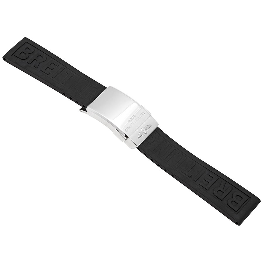 Black rubber strap. Band width: 20-18 mm. Deployment with push button release clasp. Breitling 20-18 mm Rubber Watch Band 151S-A18D.4.