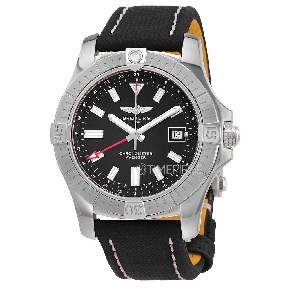 Stainless steel case with a anthracite (calfskin) leather strap. Uni-directional rotating stainless steel bezel. Black dial with luminous silver-tone hands and index hour markers. Minute markers. 24 hour markers around the outer rim. Dial Type: Analog. Luminescent hands and markers. Date display at the 3 o'clock position. Breitling Calibre 32 Automatic movement, based upon ETA 2893-2, containing 21 Jewels, bitting at 28800 vph, and has a power reserve of approximately 42 hours. Scratch resistant sapphire crystal. Screw down crown. Solid case back. Round case shape. Case size: 43 mm. Case thickness: 12.2 mm. Band width: 22 mm. Fold over clasp. Water resistant at 300 meters / 1000 feet. Functions: GMT, second time zone, hour, date, minute, second. Avenger Series. Luxury watch style. Watch label: Swiss Made. Breitling Avenger Automatic Black Dial Mens Watch A32397101B1X2.