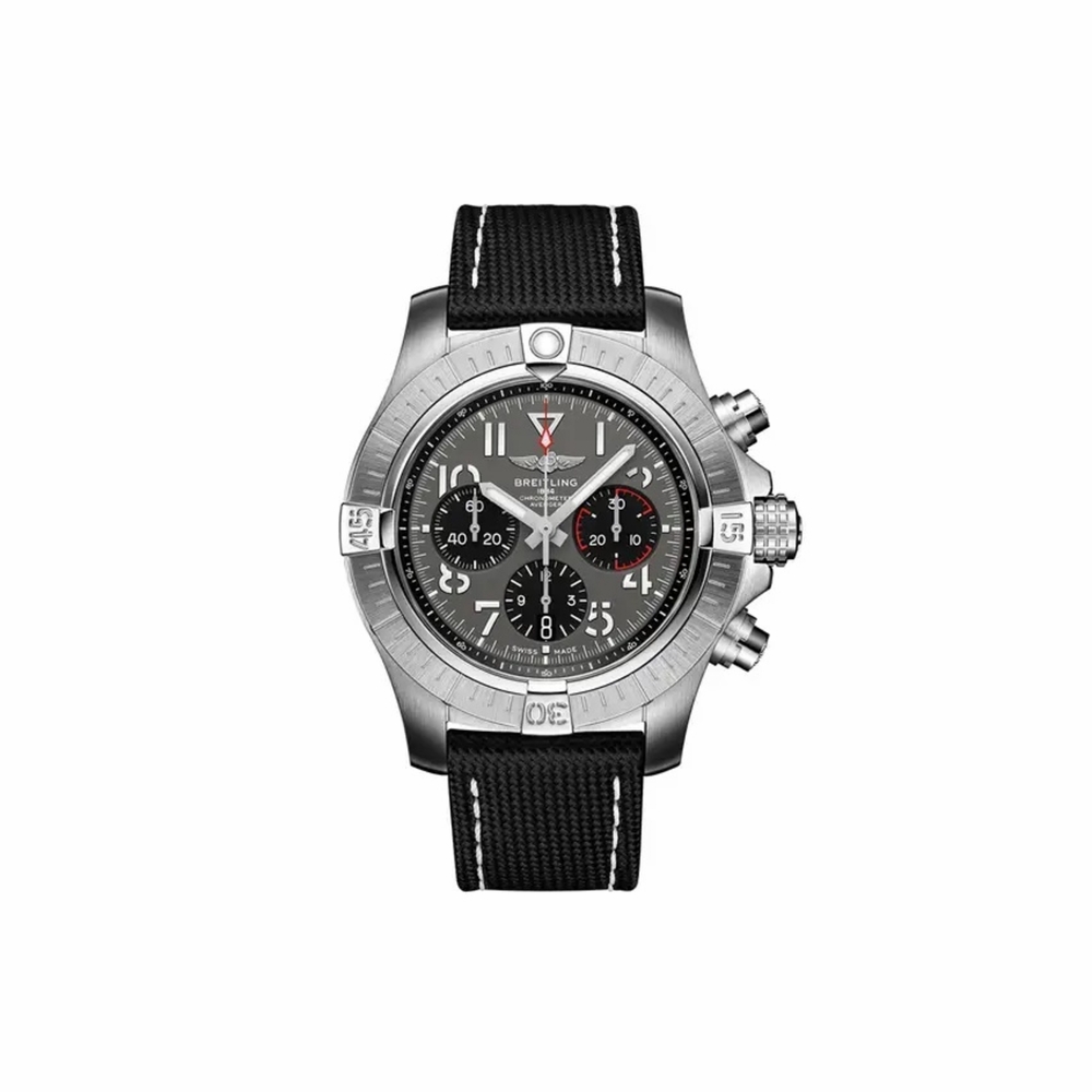 Silver-tone stainless steel case with a black calfskin leather strap. Uni-directional rotating silver-tone stainless steel bezel. Anthracite dial with silver-tone hands and index hour markers. Minute markers around the outer rim. Dial Type: Analog. Luminescent hands and markers. Date display at the 6 o'clock position. Chronograph - three sub-dials displaying: 60 second, 30 minute and 12 hour. Breitling Calibre 01 Automatic movement, containing 47 Jewels, composed of 346 parts, bitting at 28800 vph, and has a power reserve of approximately 70 hours. Scratch resistant sapphire crystal. Screw down crown. Transparent case back. Round case shape, case size: 45 mm, case thickness: 15.7 mm. Band width: 22/20 mm. Water resistant at 300 meters / 1000 feet. Functions: chronograph, column wheel, date, hour, minute, second, chronometer. Avenger B01 Series. Luxury watch style. Watch label: Swiss Made. Breitling Avenger B01 Chronograph Automatic Chronometer Anthracite Dial Mens Watch AB01821A1B1X2.