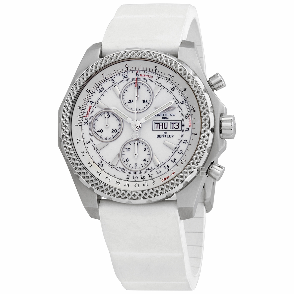 Silver-tone stainless steel case with a white rubber strap. Bi-directional rotating bezel. White dial with silver-tone hands and index hour markers. Dial Type: Analog. Luminescent hands and markers. Day of the week and date display at the 3 o'clock position. Chronograph - three sub-dials displaying: 60 second, 60 minute and 12 hour. Breitling Calibre 13B Automatic movement, based upon ETA Valjoux 7750, containing 25 Jewels, bitting at 28800 vph, and has a power reserve of approximately 42 hours. Scratch resistant sapphire crystal. Screw locked crown. Solid case back. Round case shape, case size: 44.8 mm, case thickness: 15 mm. Deployment clasp. Water resistant at 100 meters / 330 feet. Functions: chronograph, date, day, hour, minute, second. Bentley Gt Racing Series. Sport watch style. Watch label: Swiss Made. Breitling Bentley GT Racing Chronograph Automatic White Dial Mens Watch A1336313/A726.215S.A20DSA.2.