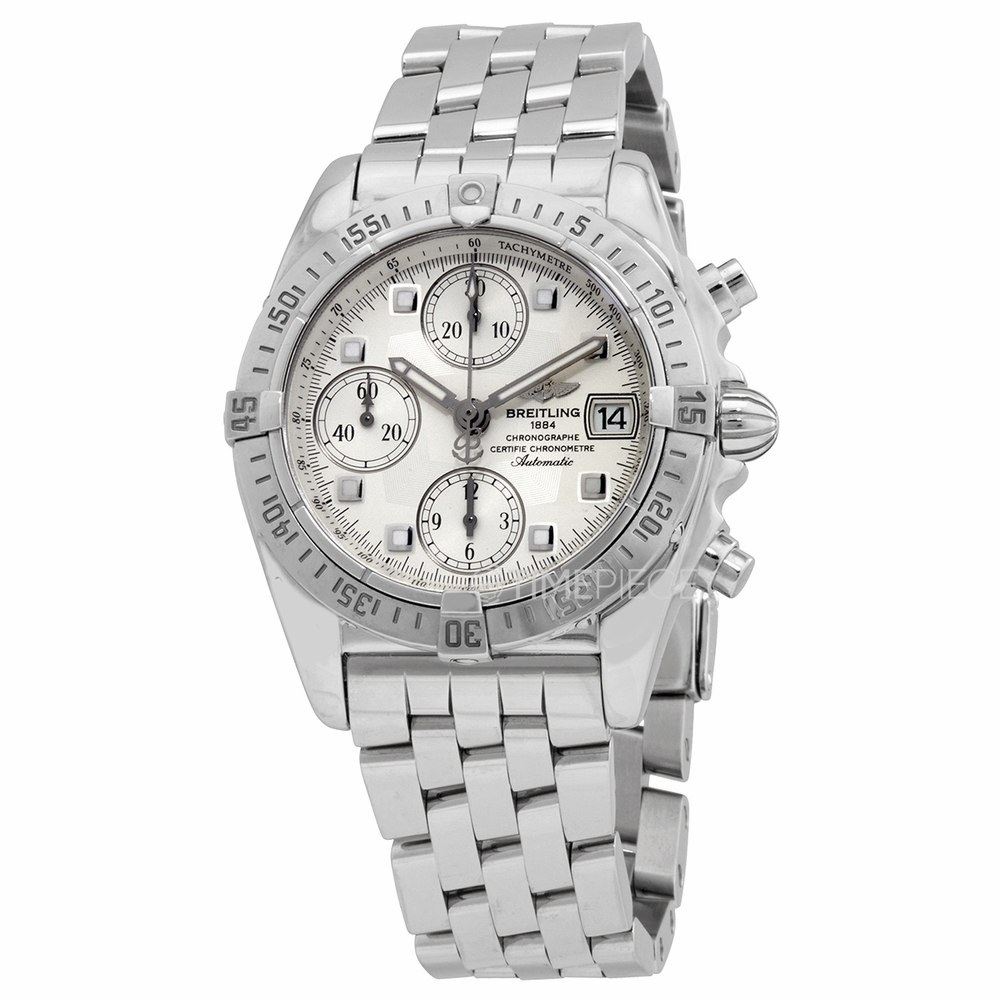 Silver-tone stainless steel case and bracelet. Uni-directional rotating silver-tone stainless steel bezel. White dial with silver-tone hands and index hour markers. Minute markers. Tachymeter markings around the outer rim. Dial Type: Analog. Luminescent hands and markers. Date display at the 3 o'clock position. Chronograph - three sub-dials displaying: 60 second, 30 minute and 12 hour. Breitling Calibre 13 Automatic movement, based upon ETA Valjoux 7750, containing 25 Jewels, bitting at 28800 vph, and has a power reserve of approximately 42 hours. Scratch resistant sapphire crystal. Screw down crown. Solid case back. Round case shape, case size: 39 mm. Water resistant at 100 meters / 330 feet. Functions: chronograph, tachymeter, date, hour, minute, second. Chrono Cockpit Series. Luxury watch style. Watch label: Swiss Made. Breitling Chrono Cockpit Chronograph Automatic White Dial Mens Watch A1335812/G576.361A.