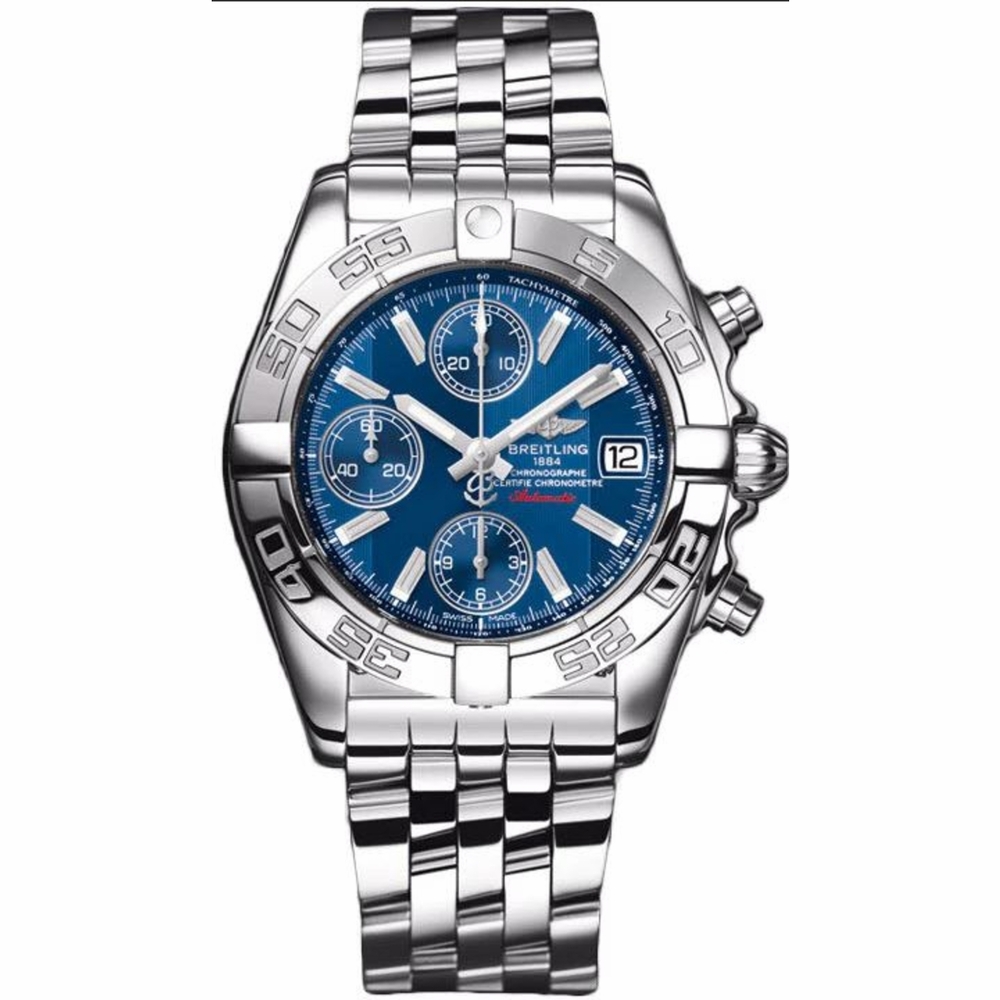 Silver-tone stainless steel case and bracelet. Uni-directional rotating bezel. Metallica blue dial with silver-tone hands and index hour markers. Tachymeter. Dial Type: Analog. Date display at the 3 o'clock position. Chronograph - three sub-dials displaying: 60 second, 30 minute and 12 hours. Breitling Calibre 13 Automatic movement, based upon ETA Valjoux 7750, containing 25 Jewels, bitting at 28800 vph, and has a power reserve of approximately 42 hours. Scratch resistant sapphire crystal. Screw down crown. Solid case back. Round case shape, case size: 39 mm, case thickness: 16.10 mm. Folding clasp. Water resistant at 100 meters / 330 feet. Functions: chronograph, date, hour, minute, second. Chrono Galactic Series. Luxury watch style. Watch label: Swiss Made. Breitling Chrono Galactic Chronograph Automatic Mens Watch A13358L2/C776.366A.