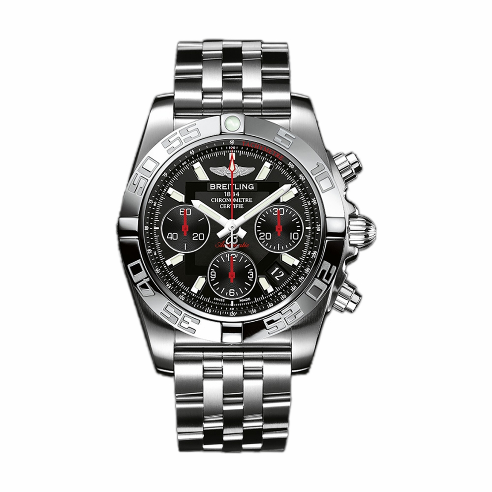 Silver-tone stainless steel case and bracelet. Uni-directional rotating silver-tone stainless steel bezel. Silver-tone hands and index hour markers. Tachymeter scale around the outer rim, minute markers around the outer rim. Dial Type: Analog. Luminescent hands and markers. Date display between 4 and 5 o'clock position. Chronograph - three sub-dials displaying: 12 hours, 30 minutes, 60 seconds. Breitling Calibre 01 Automatic movement, containing 47 Jewels, composed of 346 parts, bitting at 28800 vph, and has a power reserve of approximately 70 hours. Scratch resistant sapphire crystal. Round case shape, case size: 41 mm, case thickness: 15.4 mm. Water resistant at 300 meters / 1000 feet. Functions: chronograph, date, hour, minute, second. Watch label: Swiss Made. Breitling Chronograph Automatic Watch AB014113/BB47.381A.
