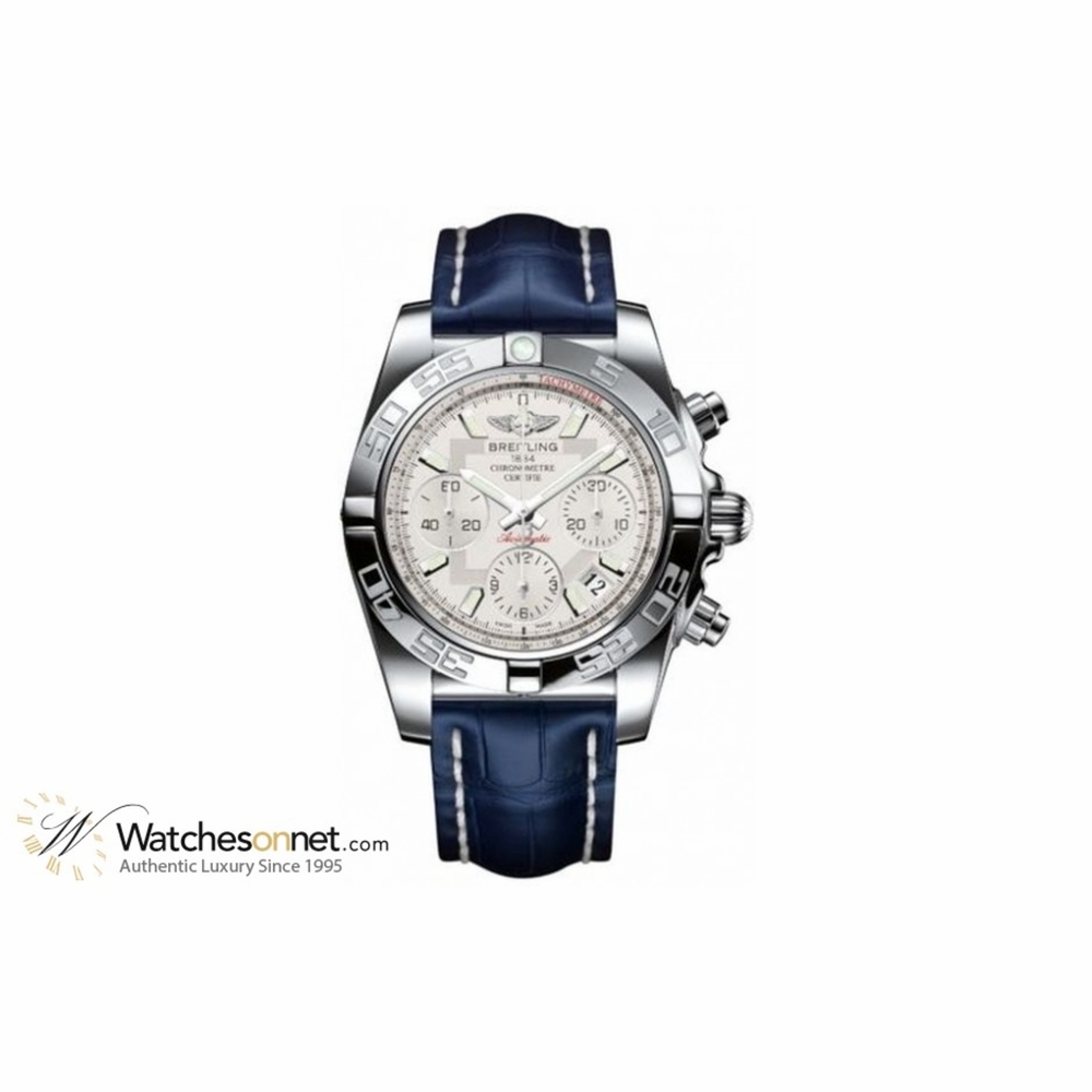 Silver-tone polished stainless steel case with a blue crocodile leather strap. Uni-directional rotating stainless steel bezel. Silver dial with silver-tone hands and index hour markers. Tachymeter. Dial Type: Analog. Luminescent hands and markers. Date display between 4 and 5 o'clock position. Chronograph - three sub-dials displaying: 60 second, 30 minute and 12 hours. Breitling Calibre 01 Automatic movement, containing 47 Jewels, composed of 346 parts, bitting at 28800 vph, and has a power reserve of approximately 70 hours. Scratch resistant sapphire crystal. Screw down crown. Solid case back. Round case shape, case size: 41 mm. Tang clasp. Water resistant at 300 meters / 1000 feet. Functions: chronograph, date, hour, minute, second. Chronomat 41 Series. Luxury watch style. Watch label: Swiss Made. Breitling Chronomat 41 Chronograph Automatic Silver Dial Mens Watch AB014012/G711.718P.A18BA.1.
